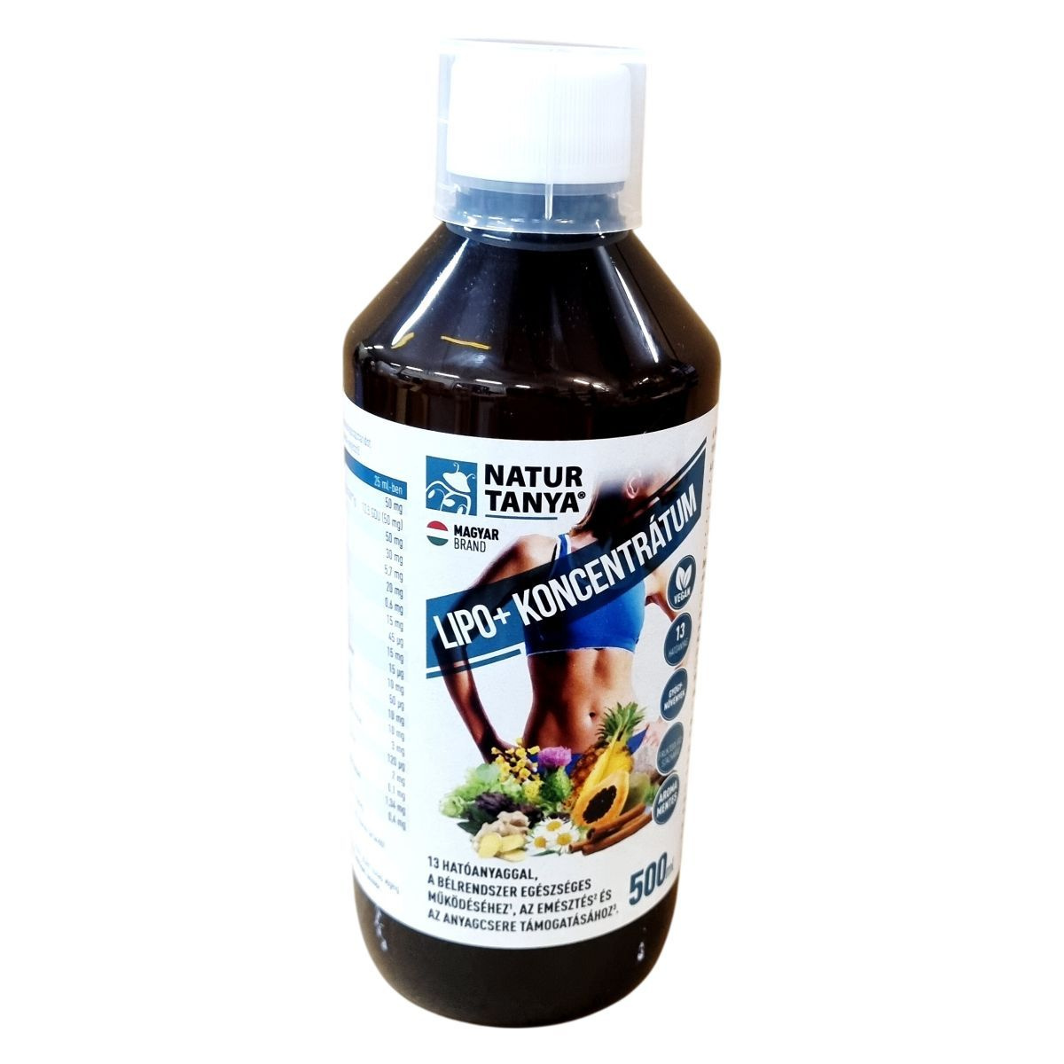 A Natur Tanya® LIPO+ KONCENTRÁTUM egy 13 hatóanyagot koncentráló, folyékony étrend-kiegészítő. Készítése során fruktooligoszacharidot és különféle növényi kivonatokat alkalmaznak, melyek között megtalálható a papaya, ananász, édesgyökér, articsóka, kamilla, komló, édeskömény, ánizs, fahéj, orvosi citromfű, gyömbér és máriatövis. A termék vegán és nem tartalmaz mesterséges aromát. Támogatni kívánja a bélrendszer egészséges működését, az emésztést és az anyagcserét, valamint hozzájárulhat a testtömegcsökkentő étrend eredményességéhez, segítheti a normál vércukorszint valamint a természetes hormonális egyensúly fenntartását. Adagolása napi 25 ml, amelyet 1,5 liter szénsavmentes vízben kell feloldani és több részletben elfogyasztani. A hosszú távú használat során is biztonságos, a javasolt adagolást azonban nem szabad túllépni. Magyar tulajdonú cég terméke, amely a hazai munkahelyek támogatását szolgálja.