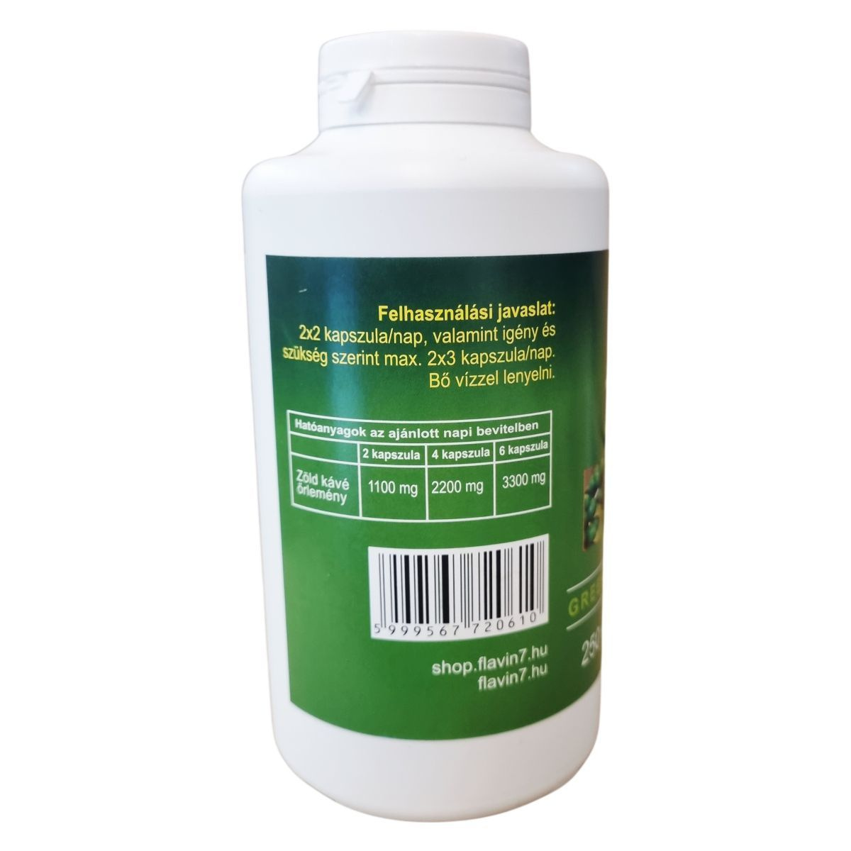 A termék zöld kávé őrleményt tartalmazó kapszula formájában készül, nettó tömege 167,5 g (250 kapszula, kapszulánként 670 mg). A kapszulák HPMC-ből (hipromellóz), illetve cink-oxidból, valamint karragénből és glicerinből álló sűrítő- és emulgeálószerekből készülnek. Az adagolás napi kétszeri 2 kapszula, szükség esetén legfeljebb napi kétszeri 3 kapszula javasolt, amely mindig bő vízzel vehető be.