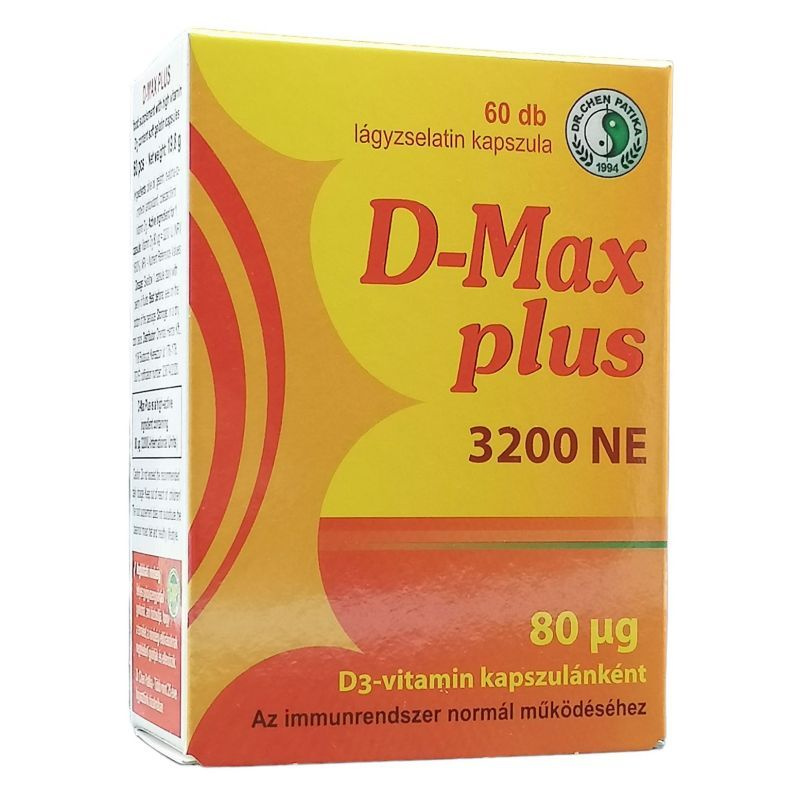 A D-Max Plus magas hatóanyag tartalmú, kapszulánként 80 µg (3200 NE-nemzetközi egység) D3-vitamint tartalmazó készítmény. A D-vitamin szükséges a csontok és fogak épségének fenntartásához, a kalcium és a foszfor felszívódásához és hasznosulásához, segít fenntartani a normál izomfunkciókat, hozzájárul az immunrendszer normál működéséhez, részt vesz a vér normál kalcium szintjének fenntartásában.
