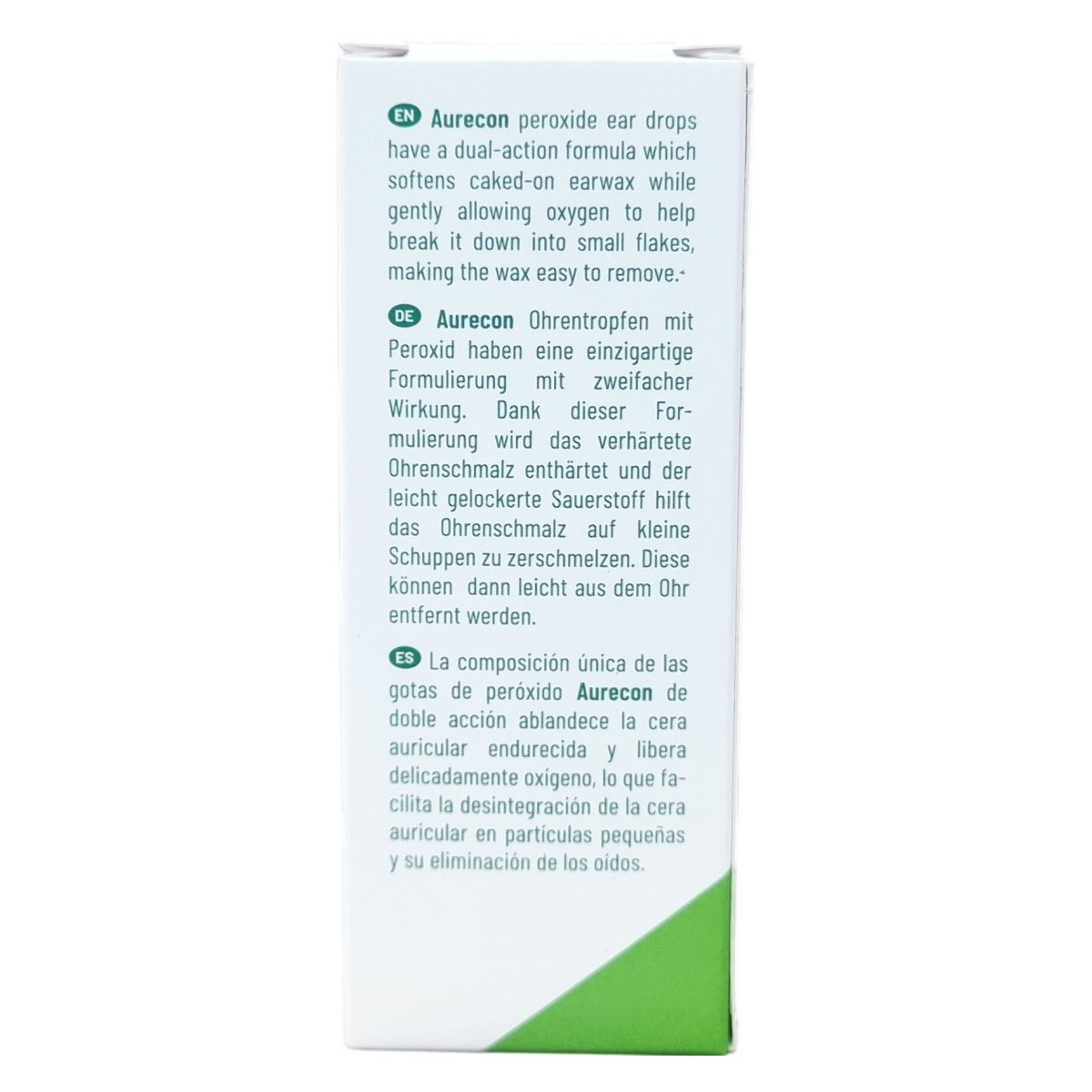 Az Aurecon peroxidos fülcsepp egyedi, kettős hatású készítmény, amely lágyítja a megkeményedett fülzsírt, majd gyengéden oxigént szabadít fel, amely segíti a fülzsír apró részekre történő lebontását. Ennek következtében a lebomlott fülzsír könnyen eltávolítható a fülből. A termék 10 ml kiszerelésben kapható, előállítása az Európai Unióban történik. A készítmény szavatossága mellett a hűtést és melegítést 5°C és 25°C között ajánlják. A gyártó Herb-pharma AG Schweiz, melynek címe Waldmannstrasse 6, 8001 Zürich, Svájc.