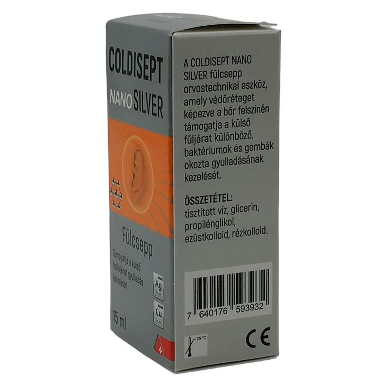 Coldisept NanoSilver fülcsepp a külső hallójárat felületét megpuhítja és eltávolítja a szennyező anyagokat, továbbá védőréteget képez a bőr felszínén.