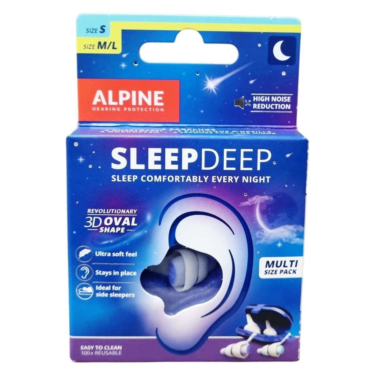 Az Alpine SleepDeep multipack ovális alakú, puha zajcsillapító maggal rendelkező füldugókat tartalmaz négy darabos kiszerelésben, amelyben két darab S, valamint két darab M/L méretű füldugó található. Az ovális forma a hallójárat természetes alakjához igazodik, így kényelmes viseletet és biztos tartást nyújt anélkül, hogy kiesne. A zajcsillapítás kiemelkedően hatékony, különösen horkolás esetén, az SNR érték 27 dB. A füldugó kivételesen puha anyaga ideálissá teszi az oldalunkon fekvők számára. Az újrafelhasználhatóság akár száz alkalommal is biztosított, így gazdaságos és környezetbarát választás. A termék szilikonmentes, könnyen tisztítható langyos szappanos vízzel, és minőségét korlátlan ideig megőrzi. A csomag praktikus tárolódobozt is tartalmaz, segítve a higiénikus tárolást. A termék FSC minősítéssel rendelkezik, mely támogatja a felelős erdőgazdálkodást.