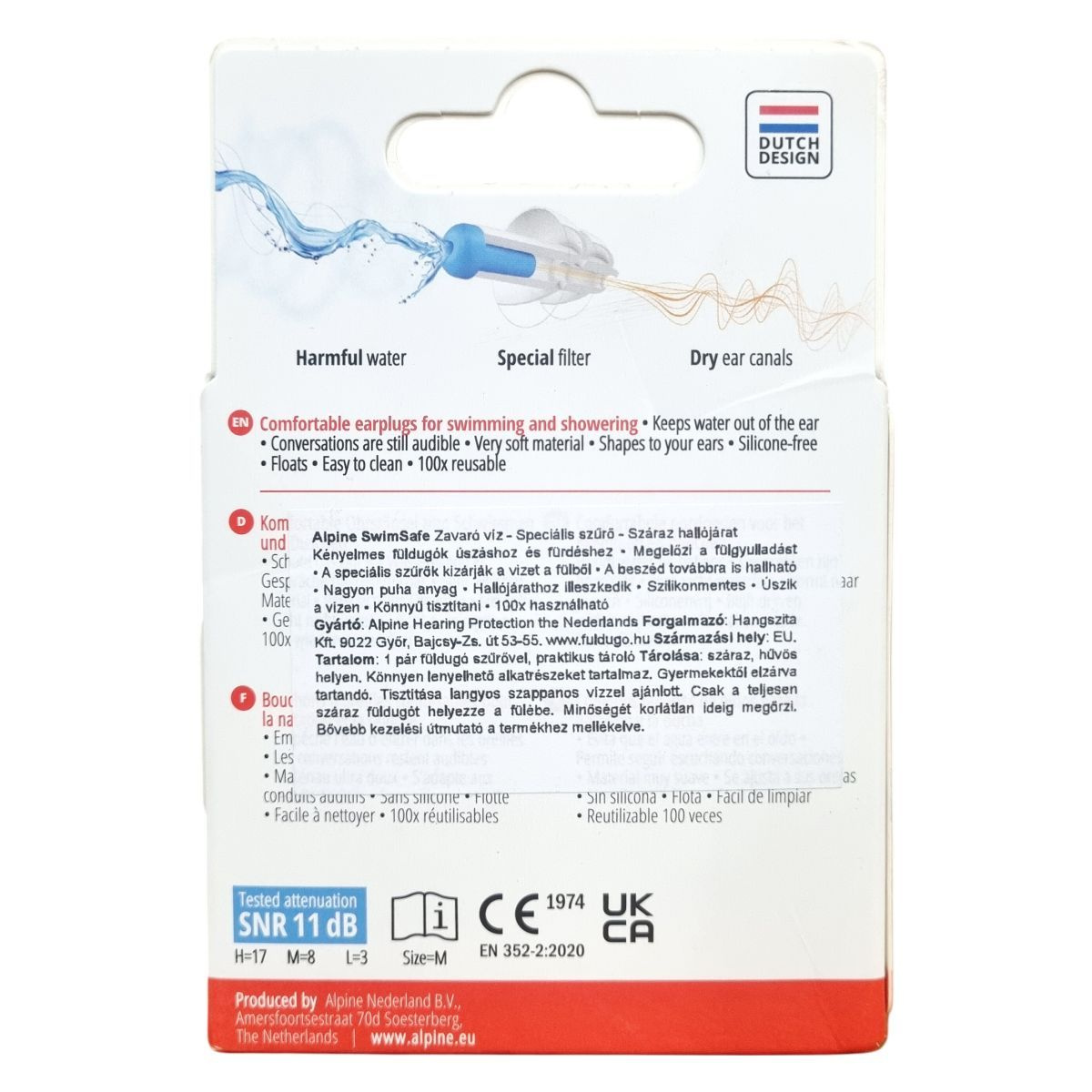 Az Alpine SwimSafe füldugó speciális vízszűrővel rendelkezik, amely kiváló védelmet nyújt a víz bejutása ellen, miközben a környezeti hangok, például a beszéd továbbra is jól hallhatók maradnak. A nagyon puha, hallójárathoz illeszkedő anyag komfortos viseletet biztosít, ráadásul szilikonmentes, így allergiások számára is alkalmas. Úszás vagy zuhanyzás során használható, és úszik a víz felszínén. Könnyen tisztítható langyos szappanos vízzel, és akár 100-szor újrahasználható. A csomag 1 pár füldugót és praktikus tárolódobozt tartalmaz. A termék minőségét korlátlan ideig megőrzi.