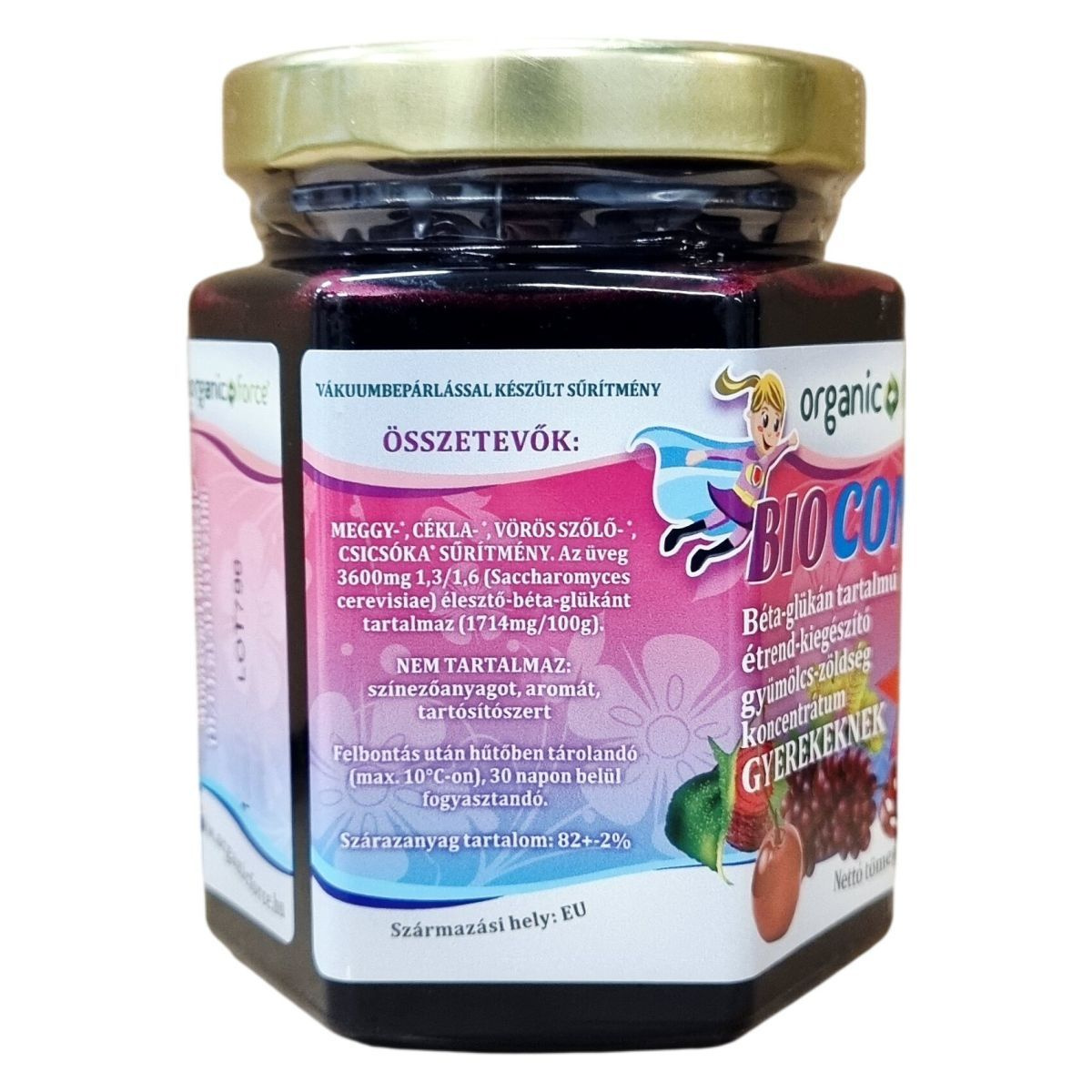 Szuperlekvár 3 év feletti gyerekeknek. 2 kg zöldség-gyümölcsből készített, magas antioxidáns hatású, magas flavonoid és polifenol tartalmú szuperkoncentrátum (BRIX: 82%).