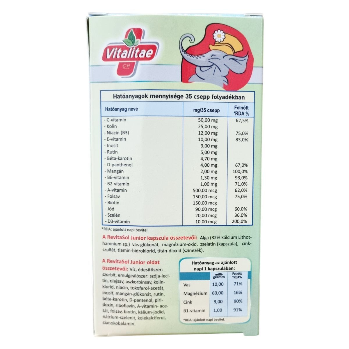 A RevitaSol Junior egy cseppentős folyadék és kapszula kombinációja, melyeket 7-14 éves gyermekek számára fejlesztettek ki. A termék vitaminokat, ásványi anyagokat és flavonoidokat tartalmaz. A doboz 30 kapszulát és 100 ml oldatot foglal magában. A folyadék édesítőszerrel készül, a kapszula pedig B1 vitamint és ásványi anyagokat tartalmaz. A terméket nedvességtől, hőtől és fénytől védve kell tárolni, gyermekek elől elzárva. A gyártás az Európai Unióban történik.