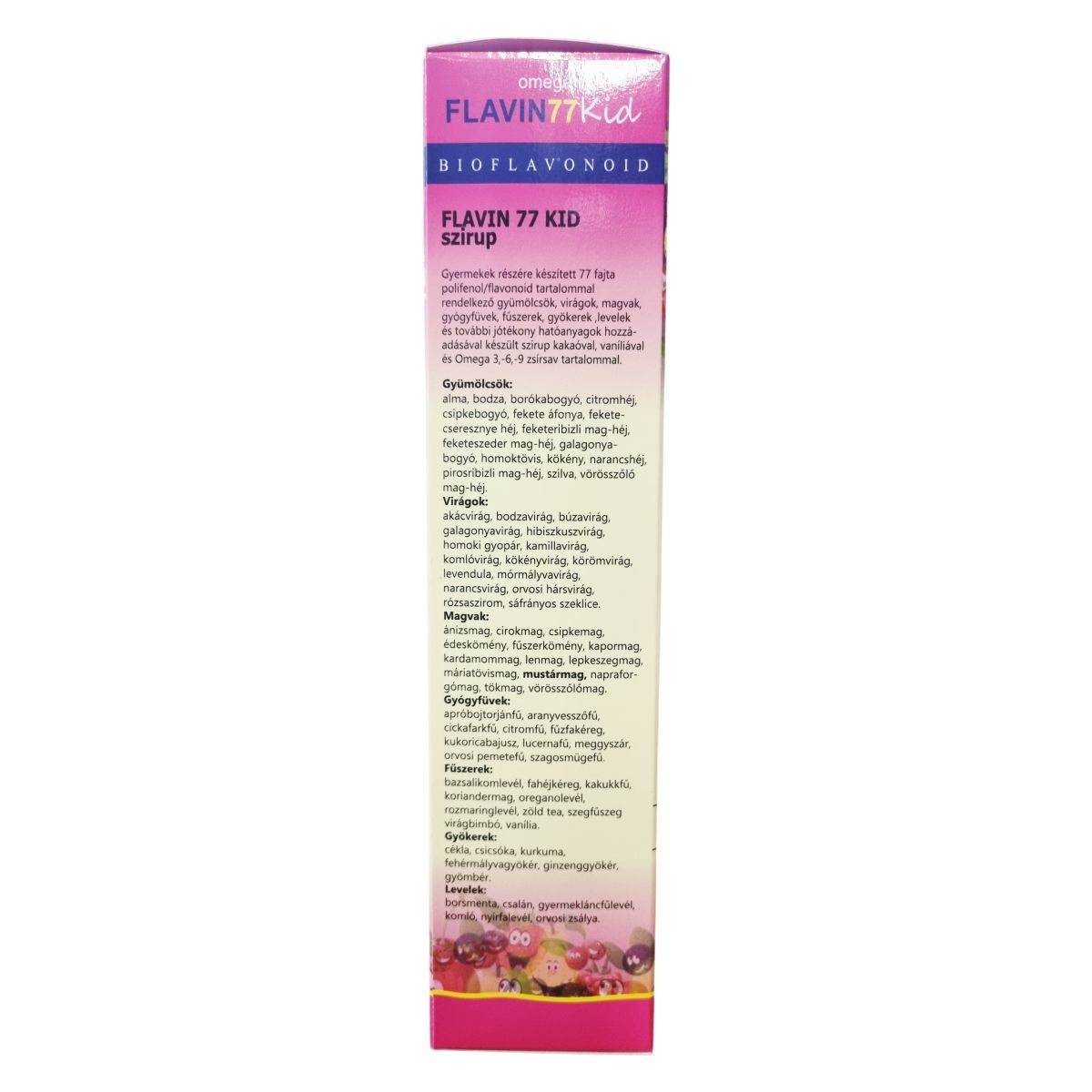 A Flavin 77 Kid szirup gyermekek számára készült különleges termék, amely 77 féle polifenolt és flavonoidot tartalmazó gyümölcsökből, virágokból, magvakból, gyógyfüvekből, fűszerekből, gyökerekből és levelekből álló szárított őrleményekből készül. A gyümölcsök között megtalálható többek között alma, bodza, fekete áfonya, homoktövis és vörösszőlő mag-héj is. A termék kakaóval, vaníliával és Omega 3,-6,-9 zsírsavakkal gazdagított, stevia édesítőszerrel készült szirup. Az összetétel részét képezi továbbá kendermagolaj és természetes aromaanyagok is. Felhívjuk a figyelmet arra, hogy a termék tartósítószert nem tartalmaz, ezért az erjedés elkerülése érdekében a tárolási és fogyasztási előírásokat pontosan be kell tartani. A szirup gyermekbarát ízesítéssel és összetétellel rendelkezik, mely a gyermeki szervezet támogatásában részesülhet.
