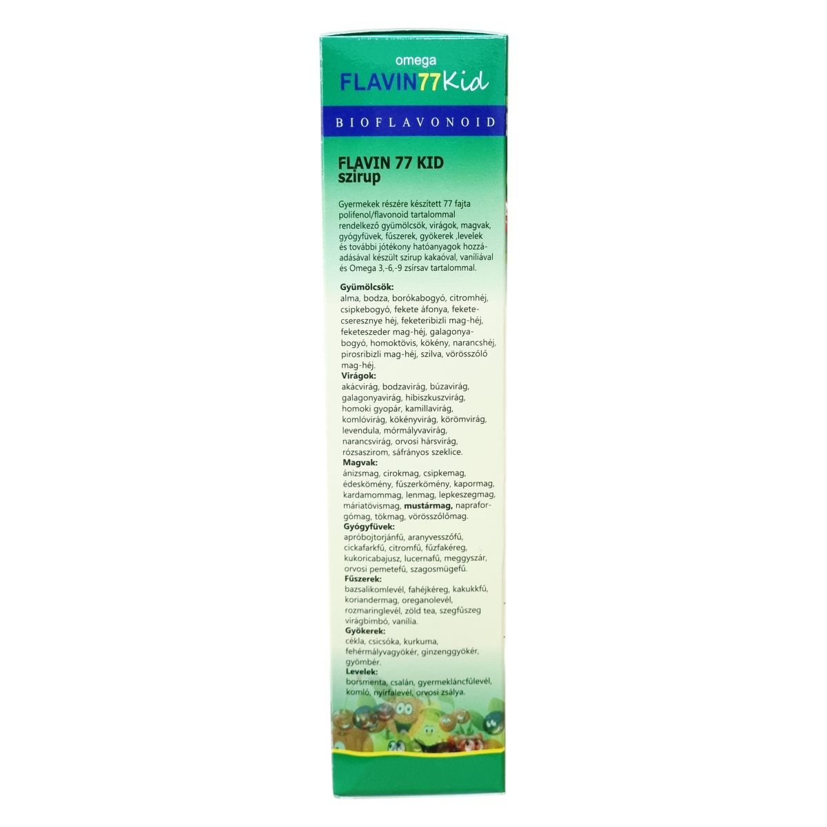 A Flavin 77 Kid egy olyan szirup, amely 77 fajta polifenol- és flavonoid tartalommal rendelkező gyümölcsből, virágból, magból, gyógynövényből, fűszerből, gyökérből és levélből készült. Ezek közé tartoznak többek között alma, bodza, fekete áfonya, homoktövis, akácvirág, kamillavirág, ánizsmag, lenmag, apróbojtorjánfű, fahéjkéreg, kurkuma, borsmenta és gyermekláncfűlevél. A termék kakaóval és vaníliával ízesített, valamint omega 3,-6,-9 zsírsavakat tartalmaz, így komplex flavonoid- és polifenolforrásként szolgálhat gyermekek részére.