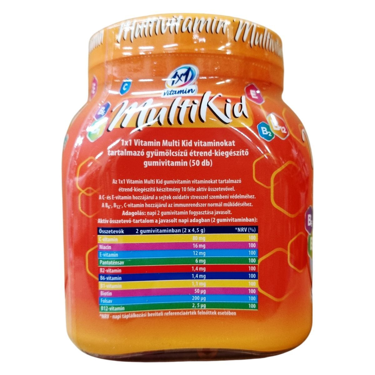 Az 1x1 Vitamin Multi Kid egy vitaminokat tartalmazó gyümölcsízű étrend-kiegészítő gumivitamin, amely 10 féle aktív összetevőt tartalmaz. A C- és E-vitamin hozzájárulhat a sejtek oxidatív stresszel szembeni védelméhez, míg a B6-, B12- és C-vitamin támogathatja az immunrendszer normál működését. A termék nettó tömege 225 g, ami 50 darab 4,5 grammos gumivitaminnak felel meg. Ez az étrend-kiegészítő különösen gyermekek számára készült, hogy a mindennapi vitaminbevitel megkönnyítésére szolgáljon. A termék származási helye az Európai Unió.