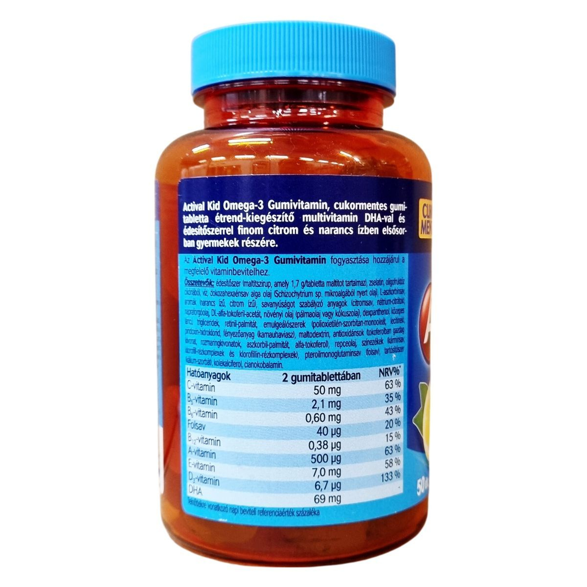 Az Actival Kid Omega-3 Gumivitamin egy cukormentes, ízletes citrom és narancs aromájú étrend-kiegészítő, amely kifejezetten gyermekek számára készült. Fő hatóanyagai közé tartoznak az immunrendszer működéséhez szükséges A-, C- és D3-vitaminok, valamint a csontok egészséges növekedését és fejlődését támogató D-vitamin. A DHA a normál agyműködés és a látás fenntartásához járulhat hozzá. A gumi tabletták édesítőszerrel (maltitszirup) készülnek, tartalmaznak mikroalgából nyert dokozahexaénsav olajat és számos vitamin-, antioxidáns- és aromaanyag-kivonatot. A hatóanyagok pontos mennyiségei a termék adagolásának megfelelően vannak meghatározva, és a termék legalább 50 darabos kiszerelésben érhető el.