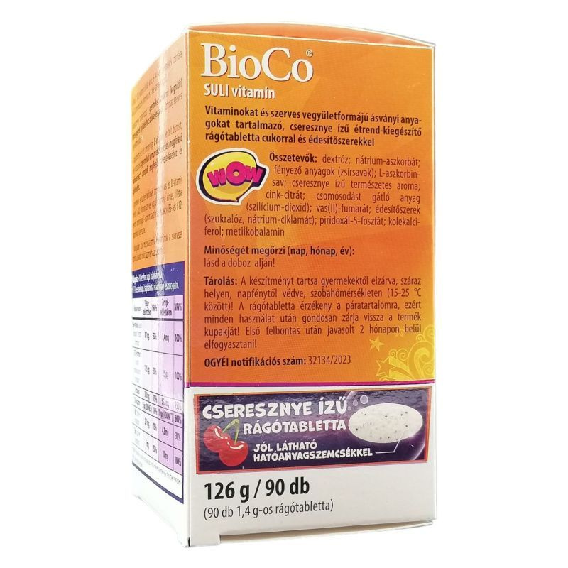 A BioCo SULI vitamin iskolás korú, 6–14 éves gyermekek számára készült, természetes aromával és többféle hatóanyaggal. Tartalmazza a gyermekek szellemi (kognitív) képességeinek fejlődéséhez szükséges vasat, kizárólag szerves vegyületformában. A rágótabletta jelentős mennyiségű D-vitamint biztosít, amely hozzájárulhat a gyermekek immunrendszerének megfelelő működéséhez, csontjaik megfelelő növekedéséhez és fejlődéséhez. A készítmény C-vitamin-, cink-, valamint bioaktív B6- és B12-vitamin-tartalommal egészül ki.