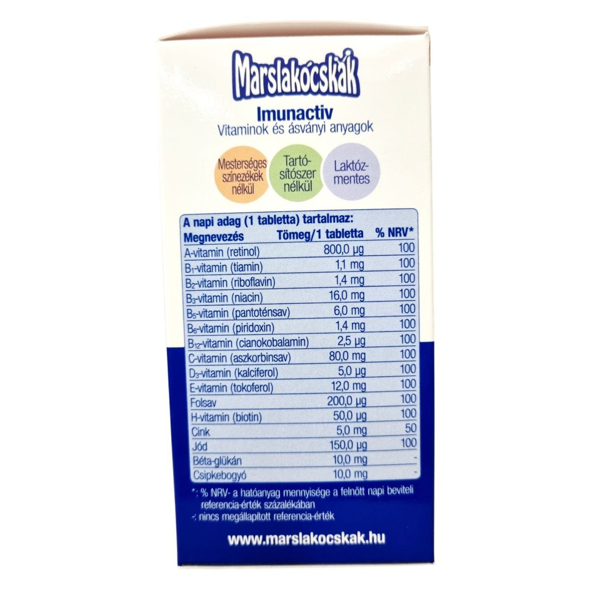 A Marslakócskák Imunactiv hatóanyagai – 12 vitamin és ásványi anyag – hozzájárulnak az egészség megőrzéséhez. Az A-, C- és D-vitamin, a folsav és a cink az immunrendszer működésében játszanak szerepet. A B₁-, B₂-, B₃-, B₅-, B₆-, B₁₂-vitaminok az idegrendszer normál működéséhez járulnak hozzá, és segítik a fáradtság csökkentését, valamint a szellemi teljesítményt. A jód hozzájárul a gyermekek növekedéséhez. A kis méretű, eperízű, szájból oldódó tablettákat 3 éves kortól ajánlják.