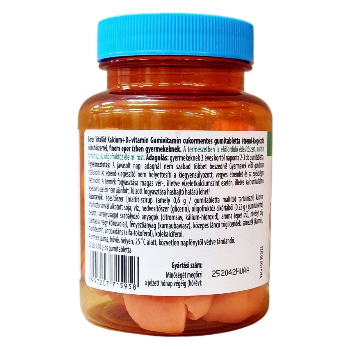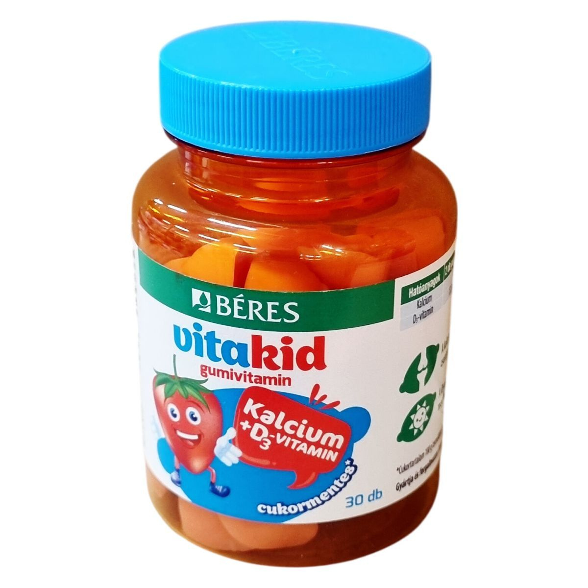A Béres Vitakid Kalcium+D3-vitamin gumivitamin gyerekek számára készített, cukormentes étrend-kiegészítő, mely eper ízű és édesítőszerként maltitot tartalmaz. Az oligofruktóz élelmi rostként van jelen a készítményben, amely elősegítheti a táplálkozásban a rostbevitel növelését. A termék hozzájárulhat a gyermekek csontjainak megfelelő növekedéséhez és fejlődéséhez a benne található kalcium és D-vitamin révén. A D-vitamin ezenkívül támogathatja a gyermekek immunrendszerének megfelelő működését. A gumitabletták adagolása napi 2-3 darab. A termék összetevői között szerepelnek természetes anyagok, például pálmaolaj vagy kókuszolaj, valamint színezék és aroma is. Fontos, hogy a termék túladagolása esetén hashajtó hatás léphet fel, ezért az ajánlott adagot nem szabad túllépni, és magas kalciumszint vagy kalciumtartalmú gyógyszerek mellett való alkalmazása nem javasolt. A készítményt gyermekek elől elzárva, megfelelő körülmények között kell tárolni.