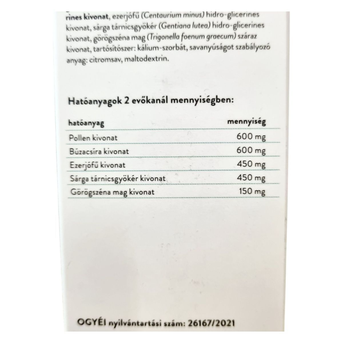 víz, fruktóz, alma lé sűrítmény, pollen hidro-glicerines kivonat, búzacsíra (Triticum aestivum) hidro-glicerines kivonat, ezerjófű (Centaurium minus) hidro-glicerines kivonat, sárga tárnicsgyökér (Gentiana lutea) hidro-glicerines kivonat, görögszéna mag (Trigonella foenum graecum) száraz kivonat, tartósítószer: kálium-szorbát, savanyúságot szabályozó anyag: citromsav, maltodextrin.