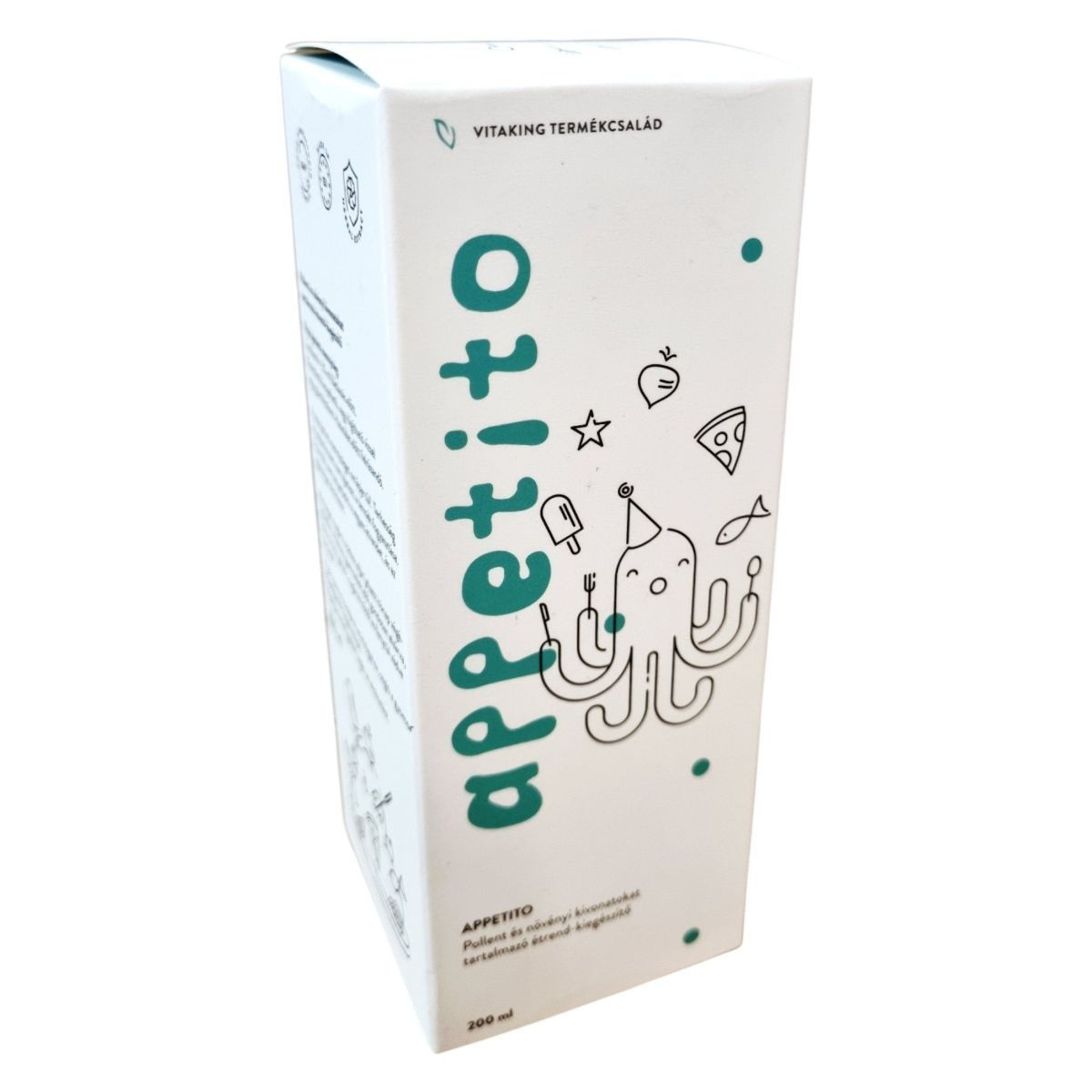 A Vitaking Appetito egy pollen és növényi kivonatokat tartalmazó étrend-kiegészítő, amely 200 ml-es kiszerelésben kapható. A termék összetevői között megtalálható a pollen, búzacsíra, ezerjófű, sárga tárnicsgyökér és görögszéna kivonat, melyek hozzájárulhatnak az étvágyhoz és segíthetik az emésztést. A termék használata előtt felrázandó, és közvetlenül lenyelhető vagy hígítható vízzel vagy gyümölcslével. A terméket száraz, hűvös helyen, sugárzó hőtől és fénytől védve kell tárolni. Terhesség és szoptatás alatt nem ajánlott a fogyasztása. Az OGYÉI nyilvántartási száma: 26167/2021.