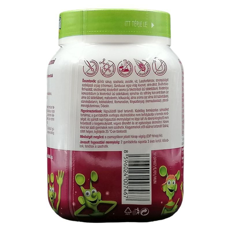 Kizárólag természetes színezékek felhasználásával készül. A fekete bodza hozzájárul az immunrendszer normál működéséhez. A C-vitamin és a cink támogatja a szervezet megfelelő védekezőképességét. 2 gumitabletta naponta 3 éves kortól. Idősebbek, felnőttek is szedhetik.