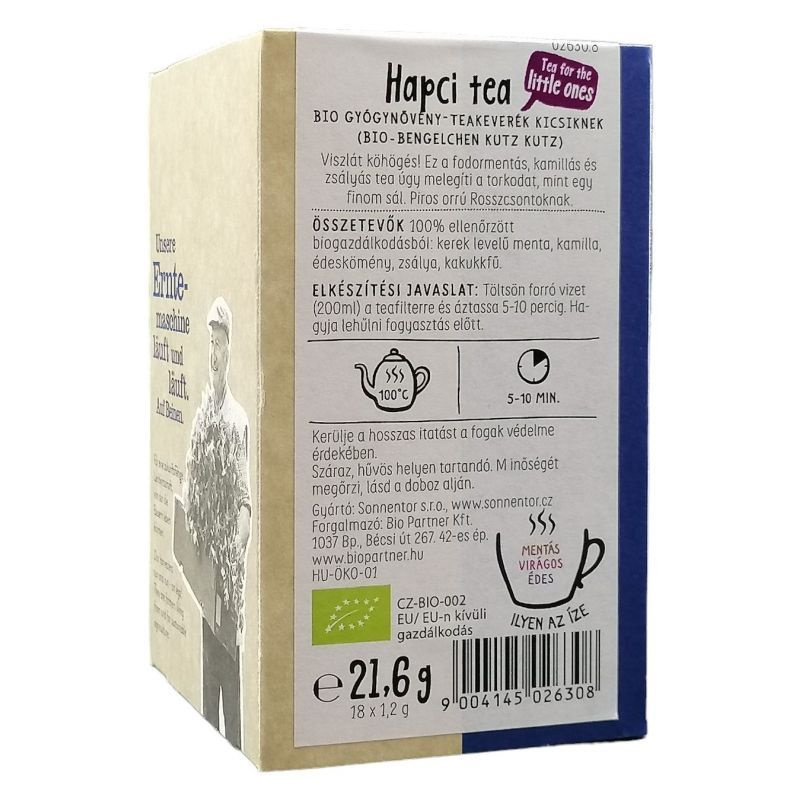 Sonnentor Hapci Tea - Bio gyógynövény - filteres teakeverék kicsiknek. 18x1,2g. Összetevők: 100% ellenőrzött biogazdálkodásból: fodormenta, bodzavirág, kamilla, édeskömény, zsálya, kakukkfű. Elkészítés: Töltsön forró vizet (200ml) a teafilterre és áztassa 5-10 percig.
