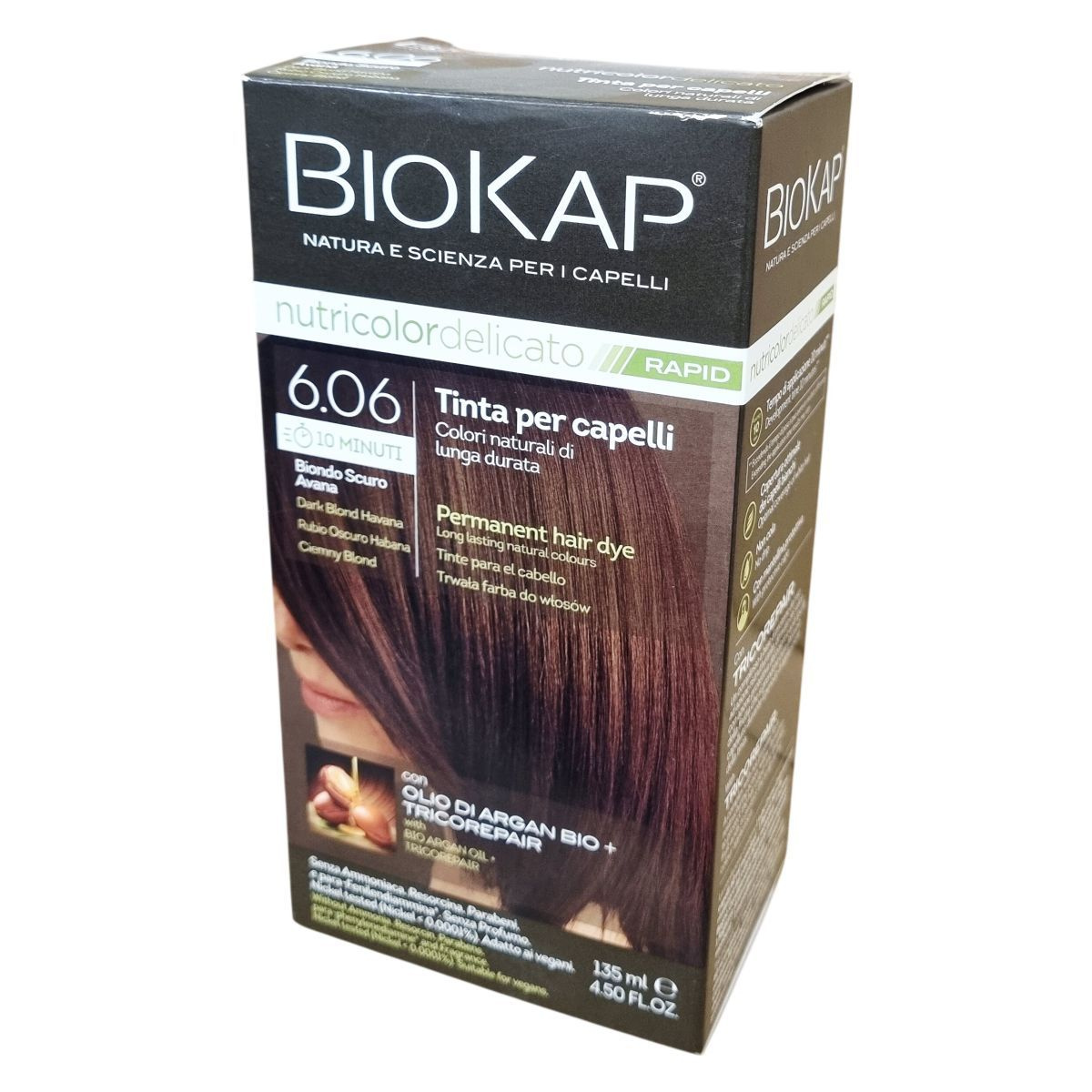 A BioKap Nutricolor Delicato Rapid hajfesték a természet és a tudomány találkozása a hajápolásban. Hatékonyan táplál, színez és erősít a rövid, 10 perces hatóidő alatt, miközben akár 80%-ban természetes eredetű összetevőkből áll. Különleges TRICOREPAIR komplexe rizsfehérjéből, fűzfa kivonatból és gyümölcssavakból áll, amelyek hozzájárulnak a haj szerkezetének újjáépítéséhez és a fejbőr védelméhez a festés alatt. A termék ammónia, resorcin, parabének, para-feniléndiamin és illatanyag nélkül készült, nikkeltesztelt (nikkel tartalom < 0,0001%) és vegánok számára is megfelelő. A csomagban külön egységcsomagolt hajfestő krém, színelőhívó emulzió, hajfestést követő kondicionáló sampon, használati utasítás, eldobható kesztyű és védőkörny található, így garantálja a biztonságos és kényelmes használatot. A terméket jól szellőző helyiségben kell alkalmazni, és figyelembe kell venni a maximális hatóidőt, mert annak túllépése eltérő eredményt okozhat. A termék kizárólag egyszeri használatra készült, és tartalmaz feniléndiamint és hidrogén-peroxidot, ezért fokozott óvatosság szükséges a használat során.