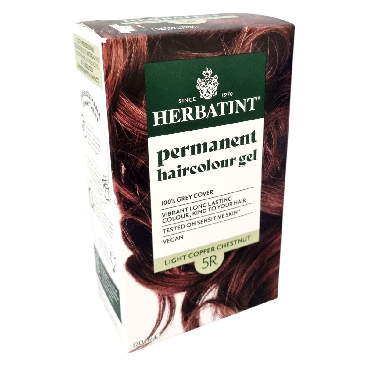 Gyengéd összetételű, világos réz gesztenye színű, tartós hajfesték gél 100%-os ősz fedéssel. Növényi kivonatokat tartalmaz, érzékeny bőrön tesztelt, vegán formula.