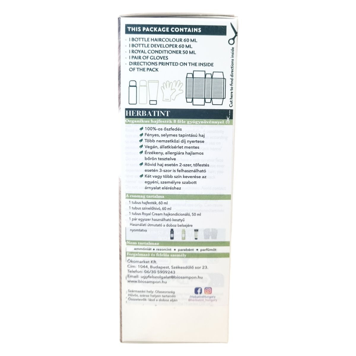 A Herbatint permanent haircolour gel egy gél állagú, csepegésmentes hajfesték, amely egyenletes felvitelt biztosít. A csomag tartalmaz egy 60 ml-es hajfestéket, egy 60 ml-es előhívót, egy 50 ml-es Royal Conditioner kondicionálót és egy pár kesztyűt. A Royal Conditioner savas pH-jú kezelés, amely segít a haj kutikulájának visszazárásában és a szín tartósságának növelésében. A feldolgozási idő 40 perc, a termék akár két alkalommal is felhasználható.