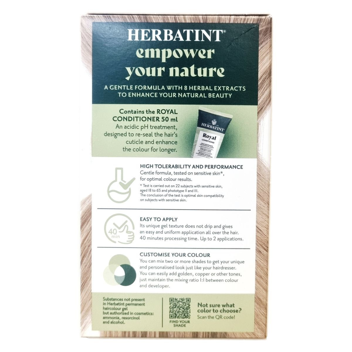 A Herbatint permanent haircolour gel egy gél állagú, csepegésmentes hajfesték, amely egyenletes felvitelt biztosít. A csomag tartalmaz egy 60 ml-es hajfestéket, egy 60 ml-es előhívót, egy 50 ml-es Royal Conditioner kondicionálót és egy pár kesztyűt. A Royal Conditioner savas pH-jú kezelés, amely segít a haj kutikulájának visszazárásában és a szín tartósságának növelésében. A feldolgozási idő 40 perc, a termék akár két alkalommal is felhasználható.