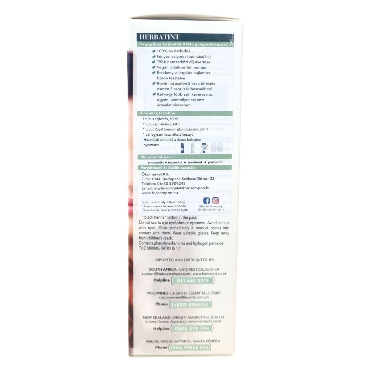 A HERBATINT tartós hajfesték gél 50 év szakértelmével és elkötelezettségével készült, kíméletes formulával, amely már az első alkalmazásnál tökéletesen fed. A termék hatóanyagai táplálják és védik a hajat és a fejbőrt, természetes és egészséges fényt adva a hajnak. Az 36 árnyalatból választható, amelyeket akár keveréssel is testre szabhat. A gél alapú hajfesték könnyen keverhető és felszívódása kellemes, szagtalan élményt biztosít. A felhasználatlan keverék eltartható későbbi alkalmazásra is. A csomag egy tubus hajfestéket (60 ml), egy tubus színelőhívót (60 ml), egy tubus Royal Cream hajkondicionálót (50 ml) és egy pár egyszer használatos kesztyűt tartalmaz, valamint részletes használati útmutatót. A termék nem tartalmaz ammóniát, rezorcint, parabéneket, alkoholt és parfümöt, valamint FSC tanúsított csomagolásban kapható, amely támogatja a felelős erdőgazdálkodást.