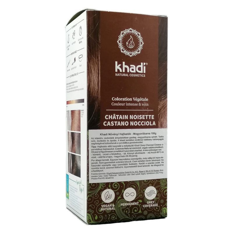 Ez a Khadi növényi hajfesték a hajat mogyoróbarna színűre festi. Az új hajszín eredménye nagymértékben függ a kiinduló hajszíntől, a hosszabb hatóidő növeli a szín intenzitását. Teltséget és ragyogást biztosít a hajnak.