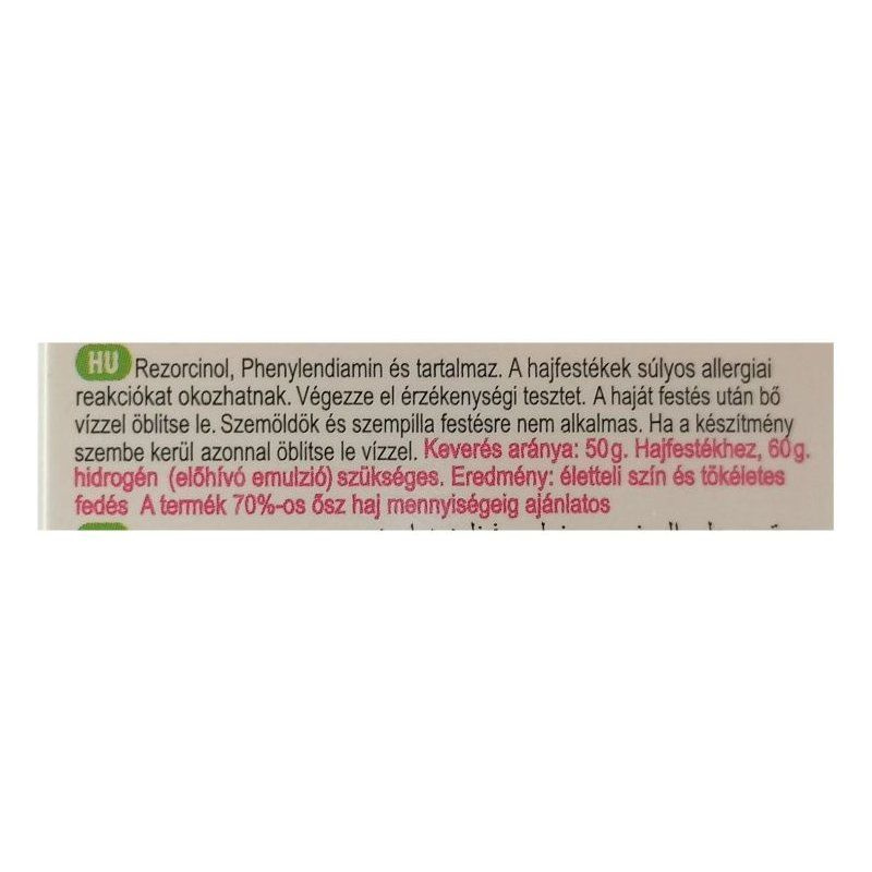 Figyelmesen olvassa el az óvintézkedéseket használat előtt, és kövesse az utasításokat! A hajfesték allergiás reakciót válthat ki. 16 éves kor alatt használata nem javasolt! Gyermekek elől gondosan elzárva tartandó! Ne használja közvetlen tartós hullám (dauer), szőkítés után, valamint henna hajfesték, illetve színesfémeket tartalmazó festékek használata után! Kizárólag külső használatra! Végezzen próbát legalább 48 órával a festék felvitele előtt! Viseljen védőkesztyűt használatkor! Ne használja a festéket, ha fejbőre érzékeny, vagy sérülés kiütés található rajta! Szintén mellőzze használatát, ha valaha már volt allergiás reakciója "fekete henna" tetoválás után! Szempilla és szemöldök festésére ne használja! Kerülje a szembe való jutást! A szemmel való érintkezés esetén hideg vízzel öblítse ki szemét! Festés után haját alaposan öblítse ki bő vízzel! Ammóniát tartalmaz. Hidrogén-peroxidot tartalmaz. Feniléndiamint tartalmaz (M01, M03, M04, M05, M06, M07, M08, M09, M10, M13, M14, M17, M18, M19, M20, M21, M22, M23, M24, M25, M26, M27, M28, M29). Hidrogén peroxidot (metilbenzolt) tartalmaz (M02, M15, M16, M24)! Rezorcint tartalmaz (M01, M02, M03, M04, M05, M06, M07, M08, M09, M10, M13, M15, M17, M18, M19, M20, M21, M23, M24, M27, M28, M29). Eredeti csomagolásban száraz, hűvös helyen tartandó (5°C és 25°C között), elzárva a közvetlen napfénytől és egyéb gyújtóforrástól!