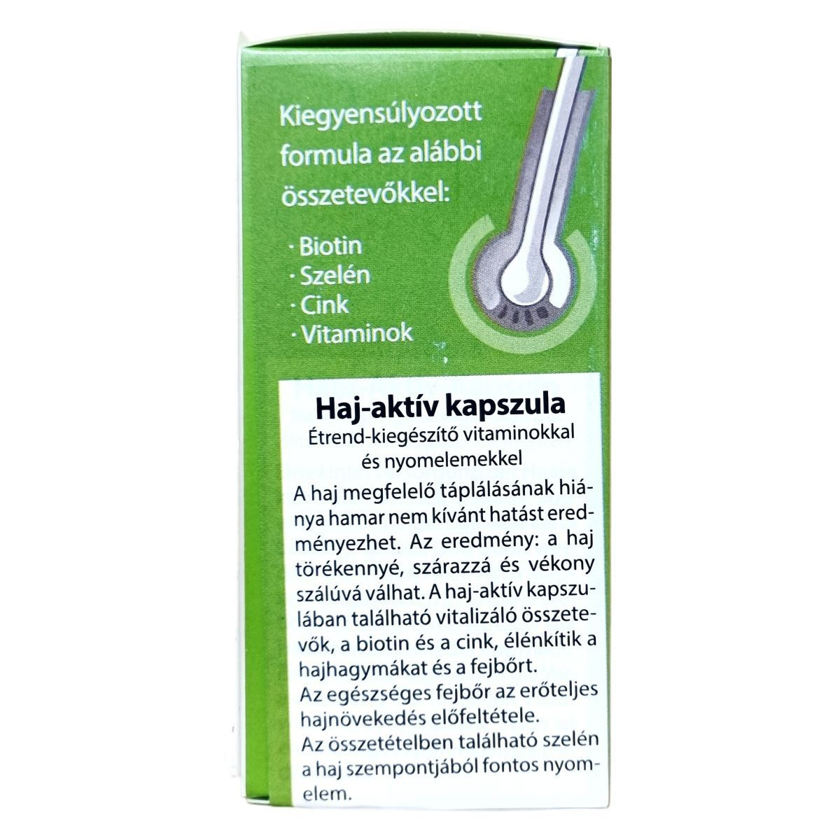 A haj-aktív kapszula egy kiegyensúlyozott formula vitaminokkal, nyomelemekkel és értékes növényi kivonatokkal, melyek hozzájárulhatnak a haj egészségéhez, valamint a fejbőr állapotának javításához. A benne található biotin és cink támogatják a hajhagymák és a fejbőr vitalitását, míg a szelén fontos nyomelemként segítheti a hajszerkezet megerősítését. Az egészséges fejbőr elősegítheti a haj erőteljes növekedését, míg a megfelelő tápanyagellátás hozzájárulhat a hajszálak egészségéhez, megakadályozva a szárazságot, törékenységet és vékonyságot. A termék laktóz- és gluténmentes, így érzékenyek számára is alkalmas lehet.