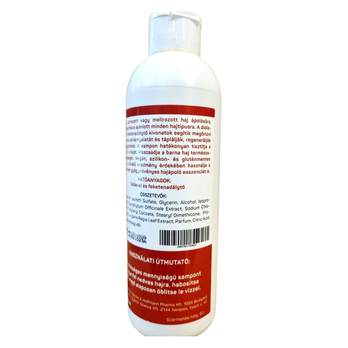 A sampon diólevél- és feketenedálytő-kivonata segíthet megőrizni a barna haj színét, ápolhatja a hajhagymákat és hozzájárulhat a fejbőr tisztaságához.