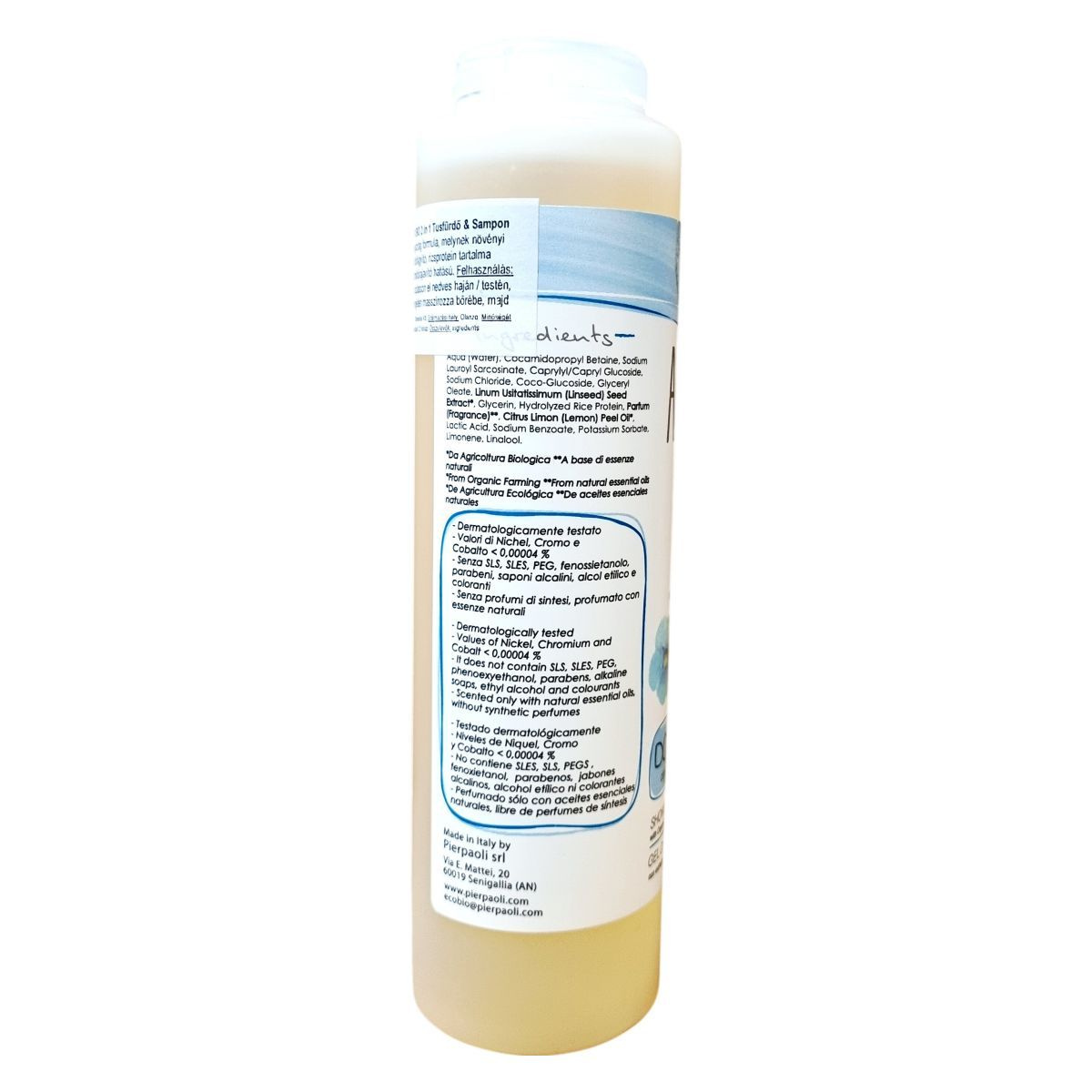 Ez a tusfürdő és sampon egyaránt alkalmas a bőr és a haj ápolására. A termék természetes tenzidekre épül, így kíméletes a bőrhöz, még az érzékeny bőrhöz is. A lenmag kivonat bőrpuhító hatással bír, míg a benne található rizsfehérjék kondicionáló és struktúrajavító hatást fejtenek ki a hajon. Növényi olajok emolliens tulajdonságai hozzájárulnak a bőr ápolásához, a termék parfümözése pedig kizárólag természetes illóolajokkal történik, mesterséges illatanyagok nélkül. A termék nem tartalmaz SLS, SLES, PEG, fenoxietanolt, parabéneket, lúgos szappanokat, etil-alkoholt és mesterséges színezékeket, és dermatológiailag tesztelt. Az összetevők részben organikus gazdálkodásból származnak. A termék Olaszországban készült.