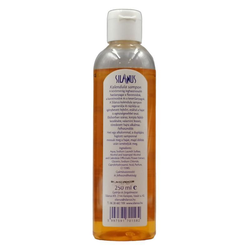 Leghasznosabb hatóanyagai a flavonoidok, a karotinoidok és a keserűanyagok. A Silanus kalendula sampon regenerálja és táplálja az igénybevett fejbőrt, ezáltal a hajat is egészségesebbé teszi. Elsősorban száraz, korpás fejbőr kezelésére alkalmas. Felhasználás: heti egy-két alkalommal használjuk. A kalendula samponnal alaposan mossuk meg a vizes hajat és dörzsöljük át a fejbőrt, majd öblítés után ismételjük meg a műveletet. Mosás után alaposan öblítsük le a sampont tiszta, langyos vízzel.