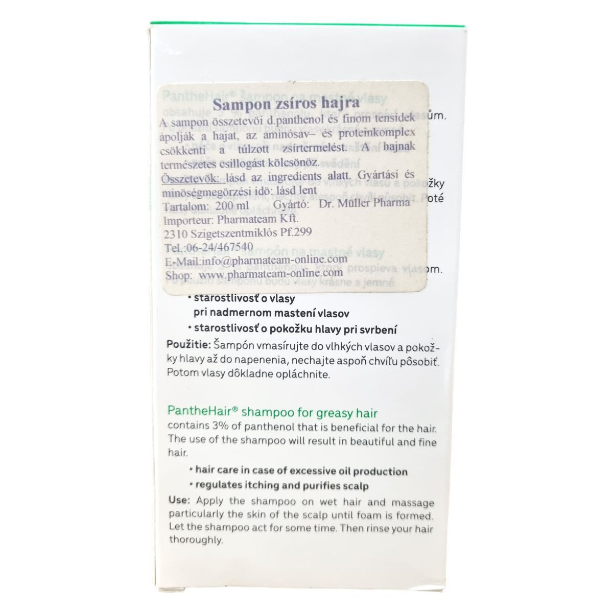 A PantheHair® sampon zsíros hajra finom tisztító anyagokat és panthenolt tartalmaz, amelyek ápolják a hajat és csökkentik a túlzott zsírtermelést. Az aminosav- és proteinkomplex támogatja a haj egészségét, természetes fényt biztosítva a hajnak. A sampon hatékonyan ápolja a fejbőrt, segít enyhíteni a viszketést, és tisztán tartja a hajat. Alkalmazása során a haj könnyen kezelhető és friss érzetet ad. A termék 200 ml-es kiszerelésben kapható, és a használati utasítást követve kellemes ápolást biztosít a zsíros haj számára.
