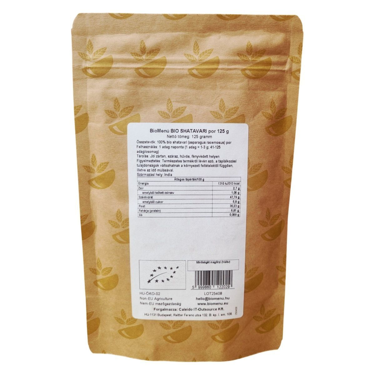 A BioMenü Shatavari por egy organikus és nyers étrend-kiegészítő, amely 100% bio shatavari port tartalmaz. A termék vegán és bio minősítéssel rendelkezik, és Indiából származik. A shatavari, más néven asparagus racemosus, egy hagyományos növényi alapanyag, amelyet az ájurvédikus gyógyászatban is használnak. A termék 125 grammos kiszerelésben kapható, és a csomagolás 41-125 adagot tartalmaz, attól függően, hogy napi 1-3 grammot fogyasztunk belőle. A termék táplálkozási tulajdonságai változhatnak a környezeti feltételektől függően, ezért fontos a megfelelő tárolás. A termék forgalmazója a Caleido IT-Outsource Kft., és rendelkezik HU-ÖKO-02 tanúsítvánnyal.
