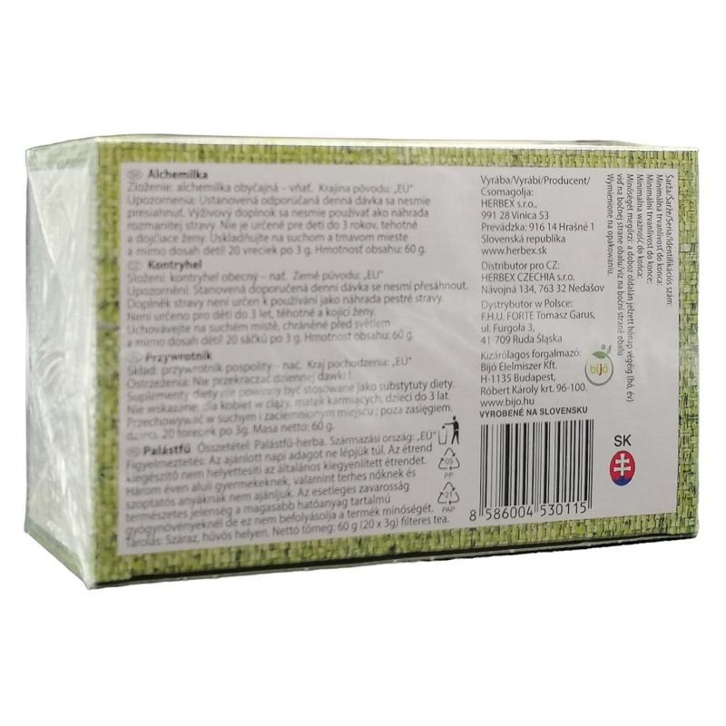 Összetétel: palástfű. Nettó tömeg: 60 g, 20 db 3 g-os filter tasak. Elkészítése: 1 filter tasakot leforrázunk 0,5 l forró vízzel, majd 10 percig állni hagyjuk.