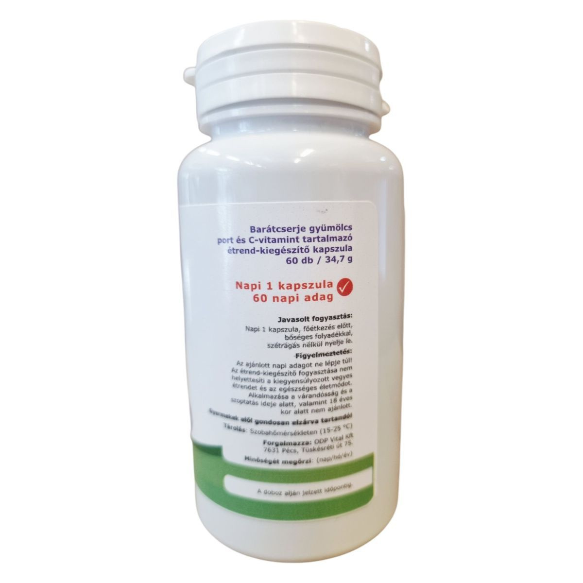 A BARÁTCSERJE Kapszula egy étrend-kiegészítő, amely barátcserje gyümölcs port és C-vitamint tartalmaz. A termék 60 kapszulát tartalmaz, ami 60 napi adagnak felel meg. A kapszulák vegánok, és a napi ajánlott mennyiség 1 kapszula, amelyet főétkezés előtt, bőséges folyadékkal kell bevenni. A termék nem ajánlott várandós és szoptató nőknek, valamint 18 év alatti gyermekeknek. A kapszulák szobahőmérsékleten tárolandók, és a forgalmazó az ODP Vital Kft.