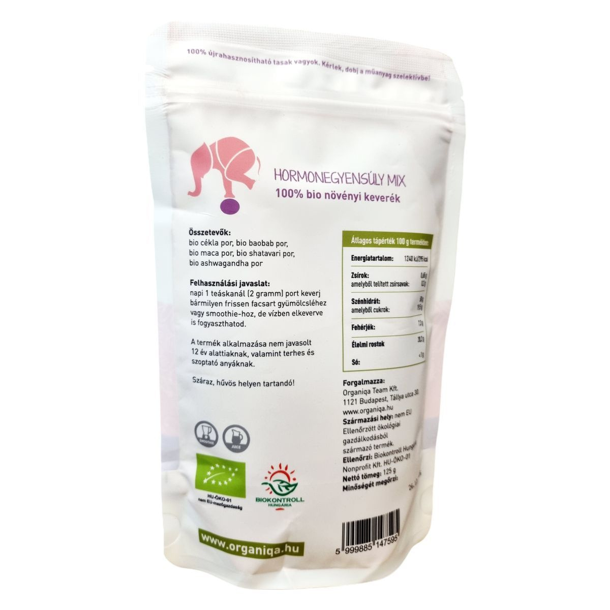 A HORMONEGYENSÚLY MIX egy 100% bio növényi keverék, amely öt különböző növényi port tartalmaz: cékla, baobab, maca, shatavari és ashwagandha. Ezek az összetevők hozzájárulhatnak a hormonális egyensúly támogatásához. A termék nem javasolt 12 év alattiaknak, terhes és szoptató anyáknak. A keveréket napi 1 teáskanál mennyiségben ajánlott fogyasztani, gyümölcsléhez vagy smoothie-hoz keverve. A termék 100% újrahasznosítható tasakban érkezik, és ellenőrzött ökológiai gazdálkodásból származik. Az energia- és tápérték adatok alapján a keverék alacsony zsírtartalmú, de gazdag élelmi rostokban.