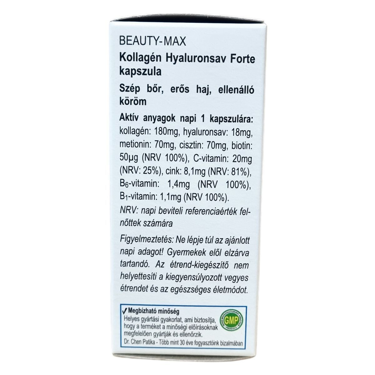 A kollagén és a hialuronsav a bőr fontos szerkezeti felépítői lehetnek. A C-vitamin hozzájárulhat a megfelelő kollagénképződéshez, amely elősegítheti a bőr normál állapotának fenntartását. A cink és a biotin hozzájárulhat a bőr és a haj egészséges állapotának támogatásához, emellett a cink részt vehet a köröm normál állapotának megőrzésében, és szerepet játszhat a sejtosztódásban valamint az A-vitamin anyagcseréjében. A B1- és B6-vitamin hozzájárulhat az idegrendszer megfelelő működéséhez. A kéntartalmú aminosavak, a metionin és a cisztin a fehérjék építőkövei lehetnek. A termék megbízható minőségben, helyes gyártási gyakorlat szerint készül, hogy megfeleljen a minőségi előírásoknak, és már több mint 30 éve jelen van a fogyasztók bizalmában.