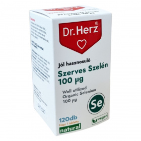 A Dr.Herz Szerves Szelén étrend-kiegészítő tabletta 100 µg szerves kötésű L-szeleno-metionint tartalmaz, amely jól hasznosulhat a szervezetben. A szelén hozzájárulhat a haj és köröm normál állapotának fenntartásához, az immunrendszer és a pajzsmirigy normál működéséhez, valamint a sejtek oxidatív stresszel szembeni védelméhez. Emellett szerepet játszhat a normál spermaképződésben is. A termék 120 darabos kiszerelésben, napi egy tabletta fogyasztásával ajánlott.
