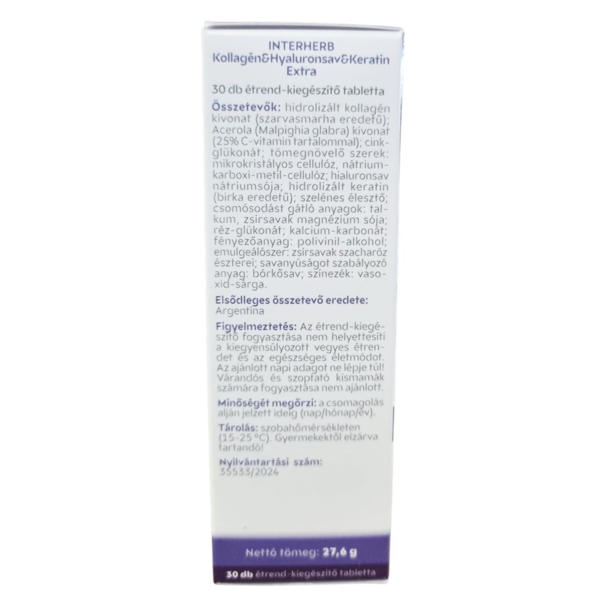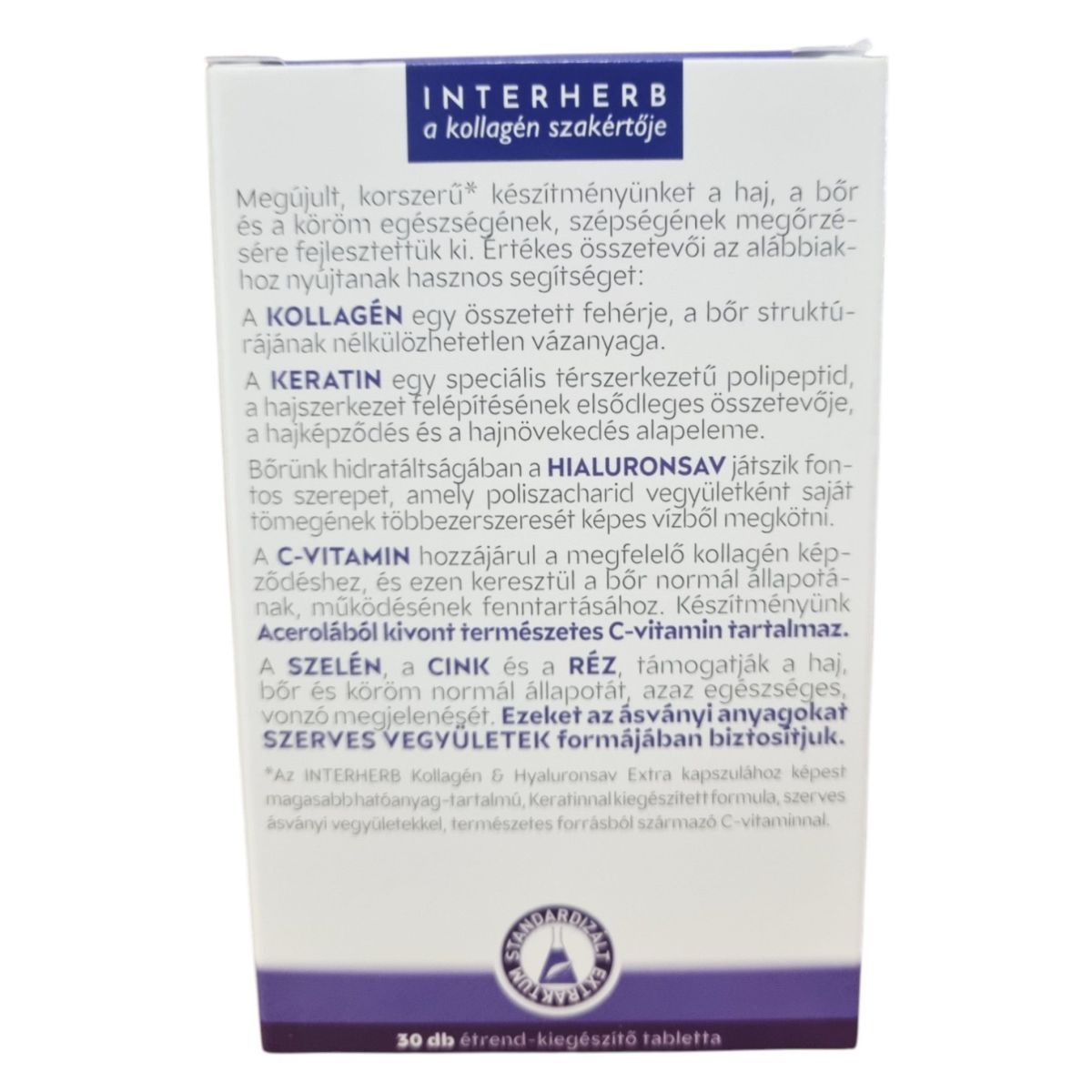 Az INTERHERB Kollagén&Hyaluronsav&Keratin Extra étrend-kiegészítő tabletta megújult, korszerű összetételével a haj, a bőr és a köröm egészségének, szépségének megőrzésére lett kifejlesztve. A kollagén, keratin és hyaluronsav tartalommal rendelkező formula hozzájárulhat a bőr struktúrájának, hidratáltságának fenntartásához, valamint a hajszövet felépítéséhez. A C-vitamin, cink, szelén és réz szerves vegyületek formájában támogatják a haj, bőr és köröm normál állapotát. A termék hidrolizált kollagén kivonatot tartalmaz, amely szarvasmarha eredetű, valamint hidrolizált keratint, amely birka eredetű. Az Acerolából kivont természetes C-vitamin hozzájárulhat a megfelelő kollagén képződéséhez.