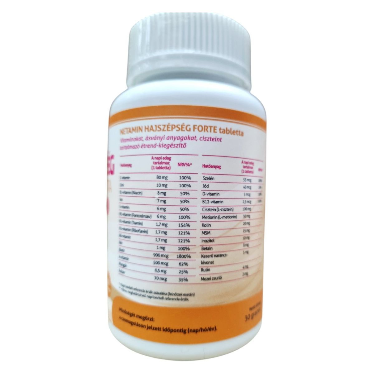 A Netamin Hajszépség Forte tabletta egy vitaminokat, ásványi anyagokat és ciszteint tartalmazó étrend-kiegészítő, amely 27 hatóanyagával hozzájárulhat a haj normál állapotának fenntartásához. A termék biotint, szelént és cinket tartalmaz, amelyek segíthetnek a haj egészségének megőrzésében. A mangán hozzájárulhat a normál kötőszövet-képződéshez, míg a réz támogathatja a haj normál pigmentációját. A tabletta bio étrendi irányzatot követ, és napi egy tabletta szedése javasolt étkezés előtt.