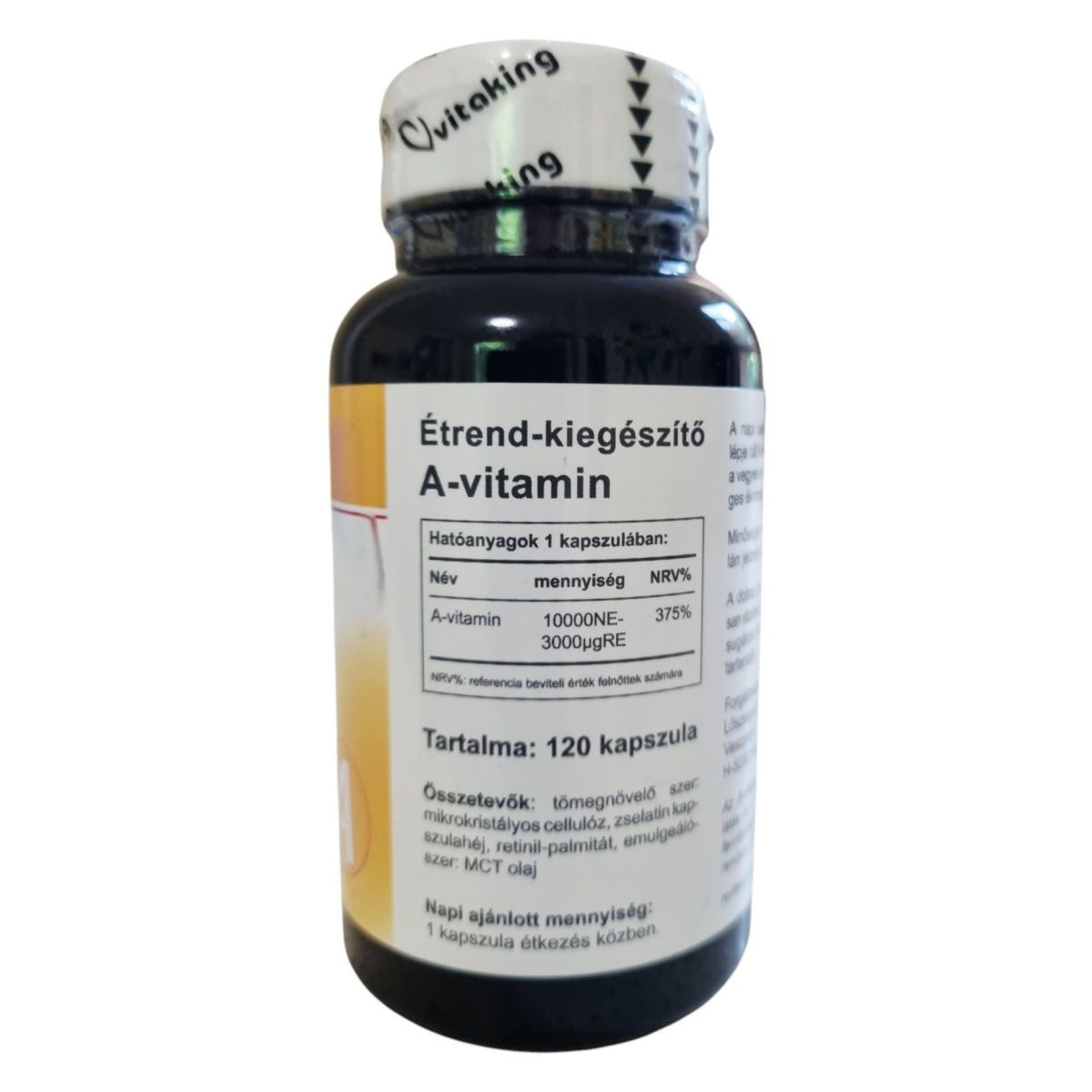A csomag 120 kapszulát tartalmaz. Egy kapszula 10 000 NE (3000 µg RE) A-vitamint biztosít, amely a felnőttek számára megadott referencia-beviteli érték 375%-ának felel meg.