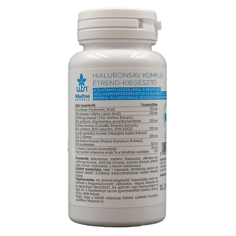 Összetevők: hialuronsav, gránátalma kivonat, szőlőmag kivonat, alfa liponsav, c-vitamin, zöld tea kivonat, zselatin (kapszula). Ajánlott mennyiség: napi 1-2 kapszula étkezéssel, bő folyadékkal.