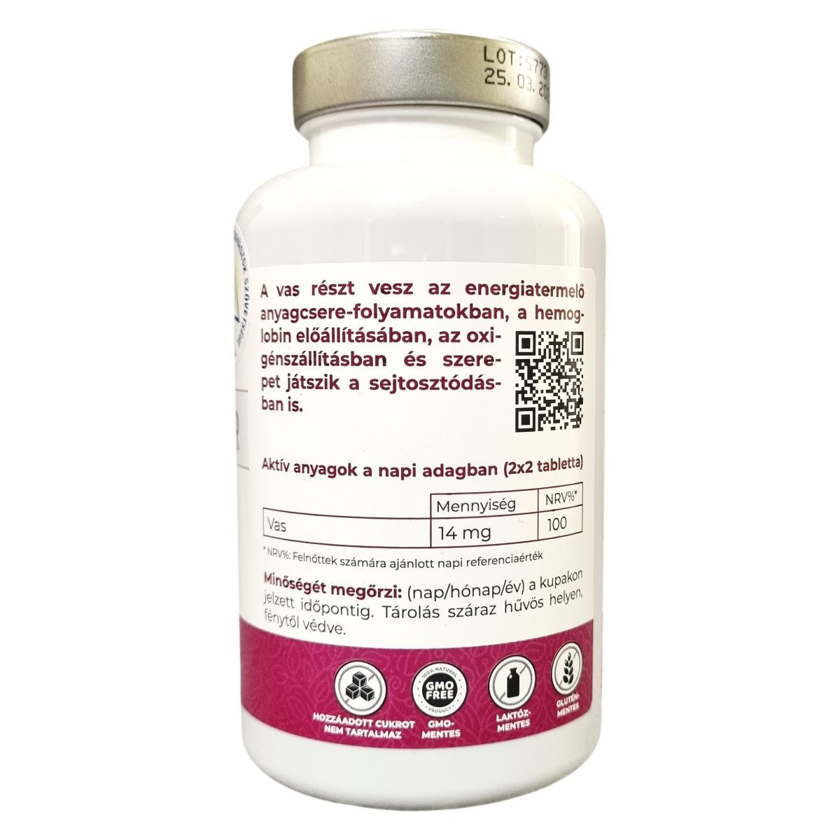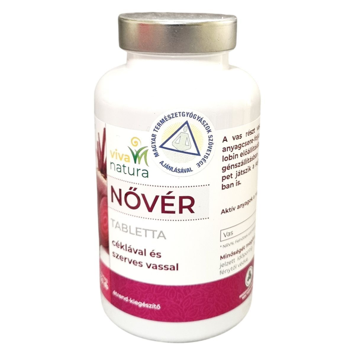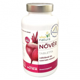 A Viva Natura Nővér tabletta céklával és szerves vassal a vas napi ajánlott mennyiségét biztosítja, amely szerepet játszik a hemoglobin előállításban és az oxigénszállításban is. A termék GMO-mentes, laktóz- és gluténmentes, valamint hozzáadott cukrot nem tartalmaz. Az étrend-kiegészítő összetevői között megtalálható a szárított cékla őrlemény és vas-fumarát, továbbá dextróz és csomósodást gátló anyagok (talkum, magnézium-sztearát). Az esetleges allergének jelenléte nyomokban előfordulhat. A termék megfelel a felnőttek számára ajánlott napi referenciaértékeknek, és alkalmas kiegészítője lehet a változatos étrendnek és az egészséges életmód támogatásának.