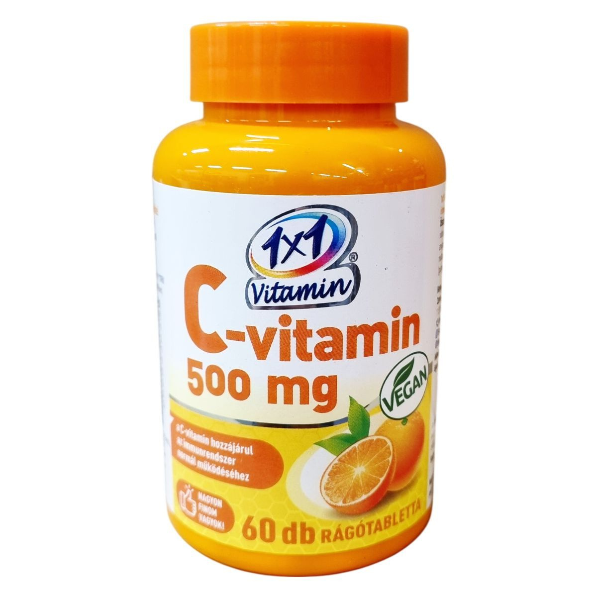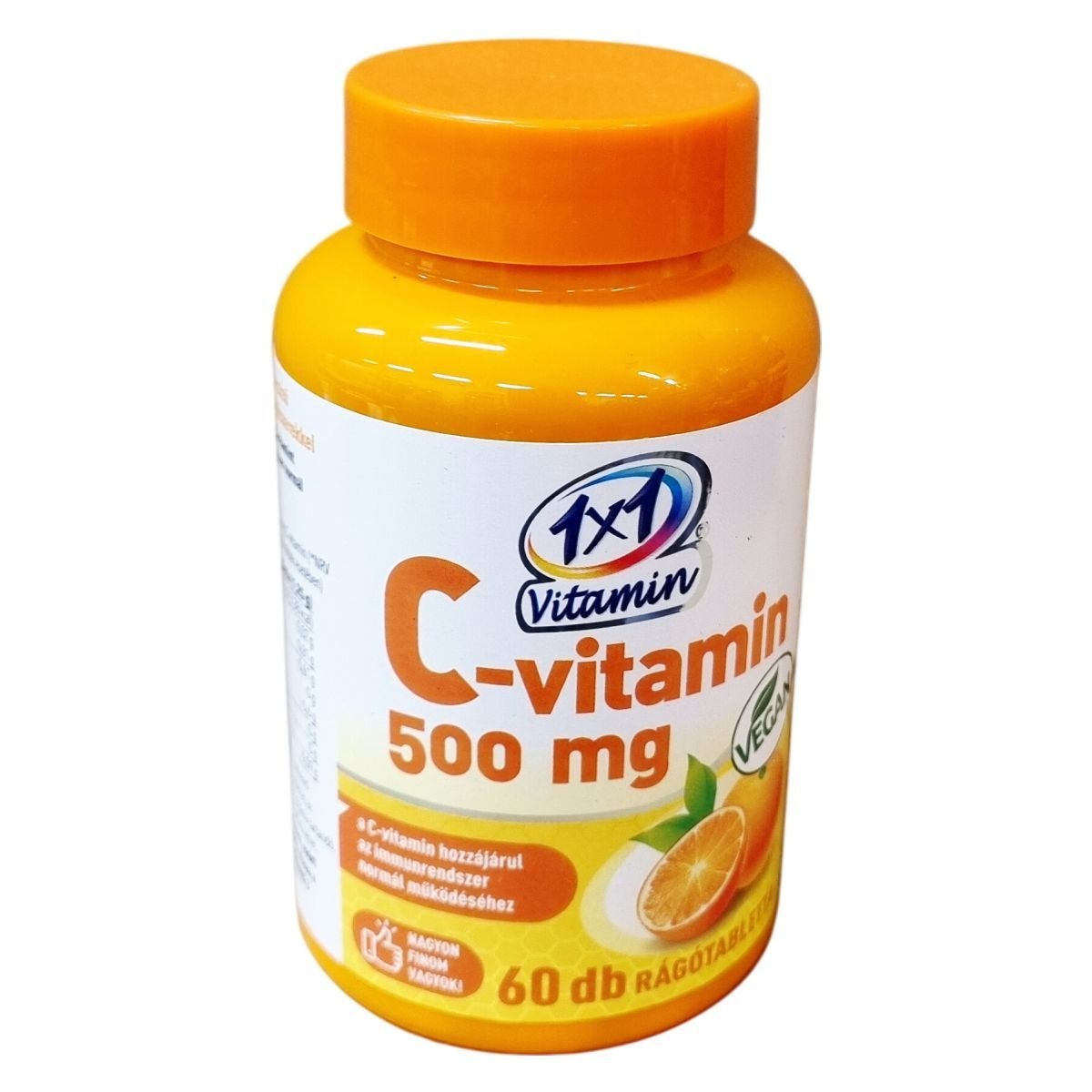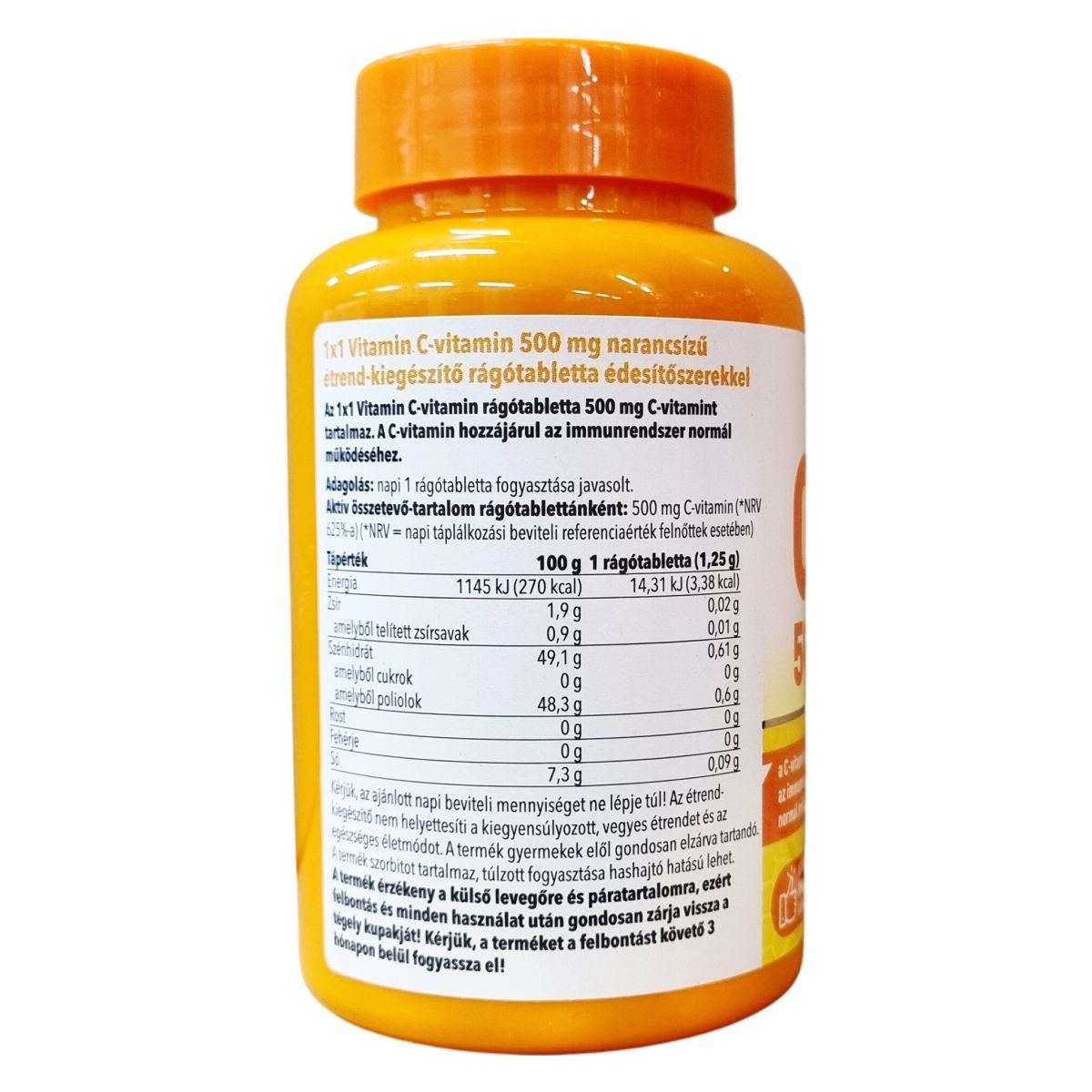 Az 1x1 Vitamin C-vitamin rágótabletta 500 mg C-vitamint tartalmaz, amely hozzájárulhat az immunrendszer normál működéséhez. Narancsízű, édesítőszerrel készült termék, amely sorbitot és szukralózt tartalmaz. A készítmény csomósodást gátló anyagokat, maltodextrint, narancs aromát és gumiarábikum stabilizátort is tartalmaz. Nettó tömege 75 g, ami 60 darab 1250 mg-os rágótablettának felel meg. Magyarországi forgalmazója a Ceres Pharma Hungary Kft. A termék származási helye az Európai Unió. Kérjük, a gyermekek elől való gondos elzárást és az adagolás betartását, továbbá a termék csomagolásának megfelelő kezelését a minőség megőrzése érdekében.