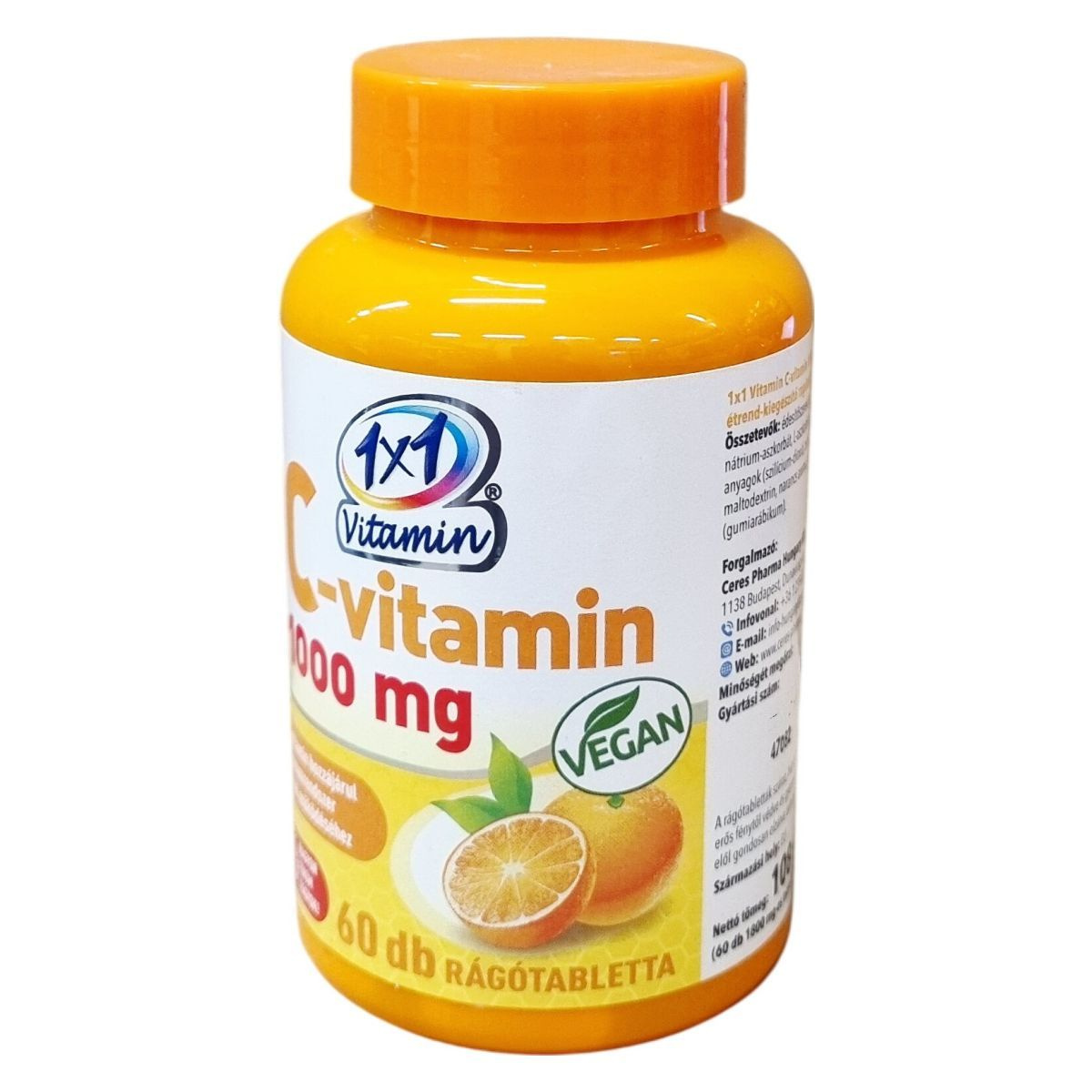 Az 1x1 Vitamin C-vitamin rágótabletta 1000 mg C-vitamint tartalmaz, amely hozzájárulhat az immunrendszer normál működéséhez. A termék narancsízű és édesítőszereket (szorbit, szukralóz) tartalmaz, és csomósodást gátló, stabilizáló anyagokat alkalmaznak az összetételében. Nettó tömege 108 g, amely 60 db rágótablettát tartalmaz. Az összetevők között szerepelnek továbbá maltodextrin, narancs aroma, gumiarábikum. A termék származási helye az Európai Unió. A rágótabletták fogyasztása során ajánlott az adagolási előírásokat betartani és a terméket gyermekektől elzárva tárolni.