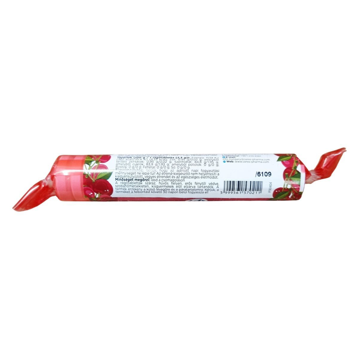Cseresznye ízű étrend-kiegészítő rágótabletta szőlőcukorral.