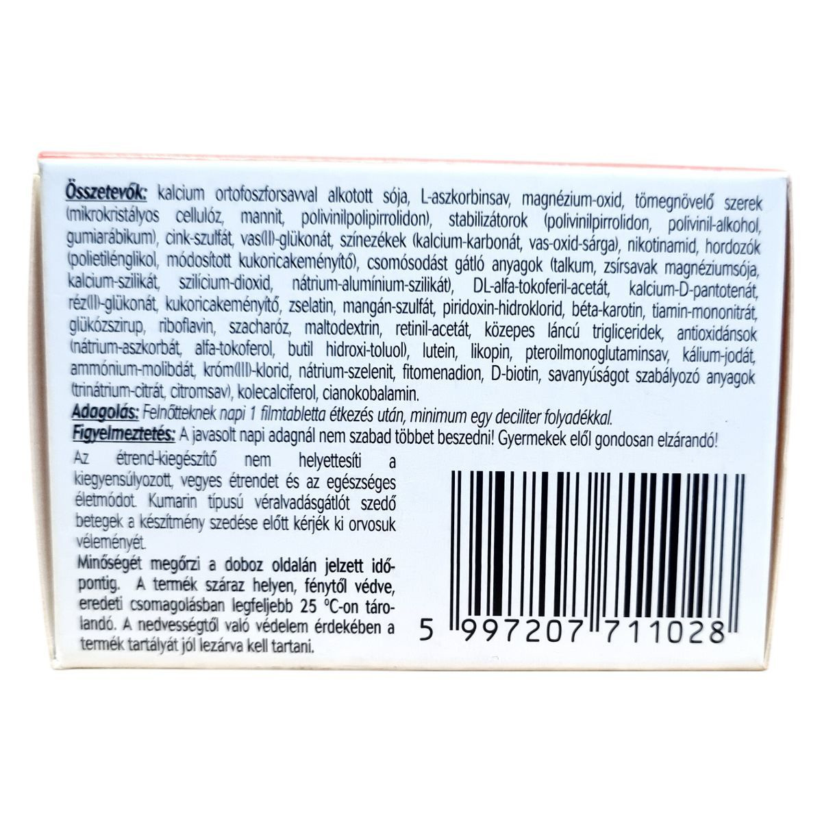 kalcium ortofoszforsav sója, L-aszkorbinsav, magnézium-oxid, mikrokristályos cellulóz, mannit, polivinilpoliprolidon, polivinilpirrolidon, polivinil-alcohol, gumiarábikum, cink-szulfát, vas(II)-glükonát, kalcium-karbonát, vas-oxid-sárga, nikotinamid, polietilénglikol, módosított kukoricakeményítő, talkum, zsírsavak magnéziumsója, kalcium-szilikát, szilícium-dioxid, nátrium-aluminium-szilikát, DL-alfa-tokoferil-acetát, kalcium-D-pantotenát, réz(II)-glükonát, kukoricakeményítő, zselatin, mangán-szulfát, piridoxin-hidroklorid, béta-karotin, tiamin-mononitrát, glükózszirup, riboflavin, szacharóz, maltodextrin, retinil-acetát, közepes láncú trigliceridek, nátrium-aszkorbát, alfa-tokoferol, butil hidroxi-toluol, lutein, likopin, pteroilmonoglutaminsav, kálium-jodát, ammónium-molibdát, króm(III)-klorid, nátrium-szelenit, fitomenadion, D-biotin, trinátrium-citrát, citromsav, kolecalciferol, cianokobalamin.