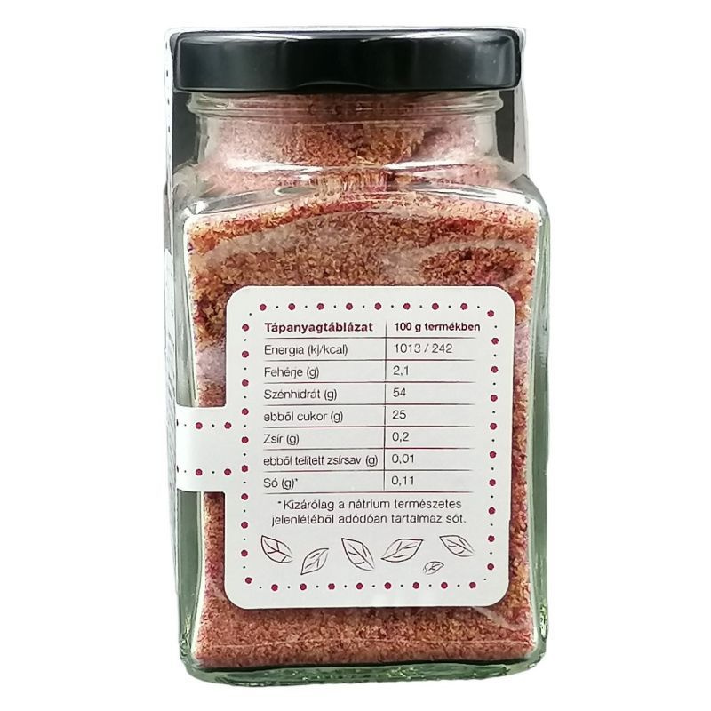 Gyümölcsalapú szuperkoncentrátum csipkebogyóval, bodzával és fekete bodzával, kristályos formában. Hozzáadott cukrot nem tartalmaz, vegán étrendbe is beilleszthető.