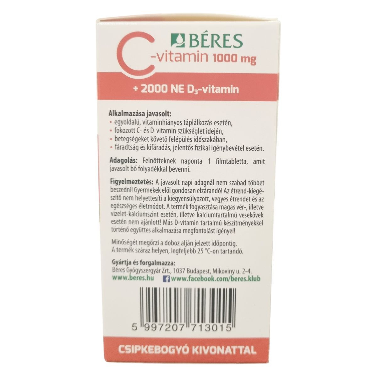 A Béres C-vitamin 1000 mg + 2000 NE D3-vitamin retard filmtabletta csipkebogyó kivonattal étrend-kiegészítő készítmény, melynek egy filmtablettája 1000 mg C-vitamint, 50 µg (2000 NE) D3-vitamint és 25 mg csipkebogyó száraz kivonatot tartalmaz, utóbbi 2:1 drog:extraktum arányban. A C-vitamin hozzájárulhat az immunrendszer és az idegrendszer megfelelő működéséhez, a fáradtság és a kifáradás csökkentéséhez, továbbá a normál energiatermelő anyagcsere-folyamatokhoz. Emellett antioxidáns hatású anyagként a sejtek oxidatív stresszel szembeni védelmét támogathatja. A D-vitamin az immunrendszer normál működésében és az egészséges izomfunkció fenntartásában játszhat szerepet, valamint részt vehet a sejtosztódás folyamatában. A termék ellenőrzött alapanyagokból és rendszeresen ellenőrzött hatóanyag-tartalommal készül, hazai fejlesztésű készítményként. Alkalmazása javasolt többek között egyoldalú, vitaminhiányos táplálkozás esetén, fokozott vitamin-szükséglet idején, betegségeket követő felépülés során, valamint fáradtság és jelentős fizikai igénybevétel időszakában.