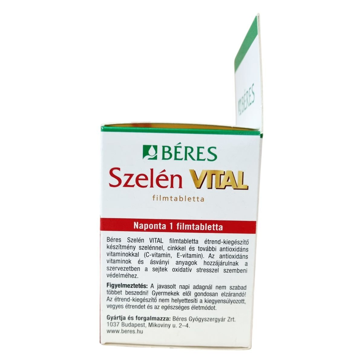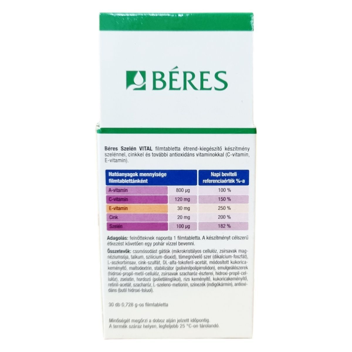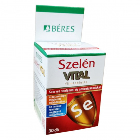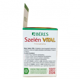 A Béres Szelén VITAL filmtabletta szelénnel, cinkkel és antioxidáns vitaminokkal (C-vitamin, E-vitamin) készül. A szelén hozzájárulhat a pajzsmirigy megfelelő működéséhez, a haj és a köröm normál állapotának fenntartásához, a sejtek oxidatív stresszel szembeni védelméhez és az immunrendszer megfelelő működéséhez. A C- és E-vitamin, valamint a cink antioxidáns hatásuk révén támogathatják a sejtek védelmét az oxidatív stresszel szemben. Az A- és a C-vitamin, valamint a cink hozzájárulhatnak az immunrendszer megfelelő működéséhez, így az egészség megőrzéséhez. A készítményben található antioxidáns vitaminok és ásványi anyagok egy komplex támogatást nyújthatnak a szervezet számára. A termék napi egyszeri adagolása egyszerűvé teszi a használatát, amelyet célszerű étkezés után egy pohár vízzel bevenni.